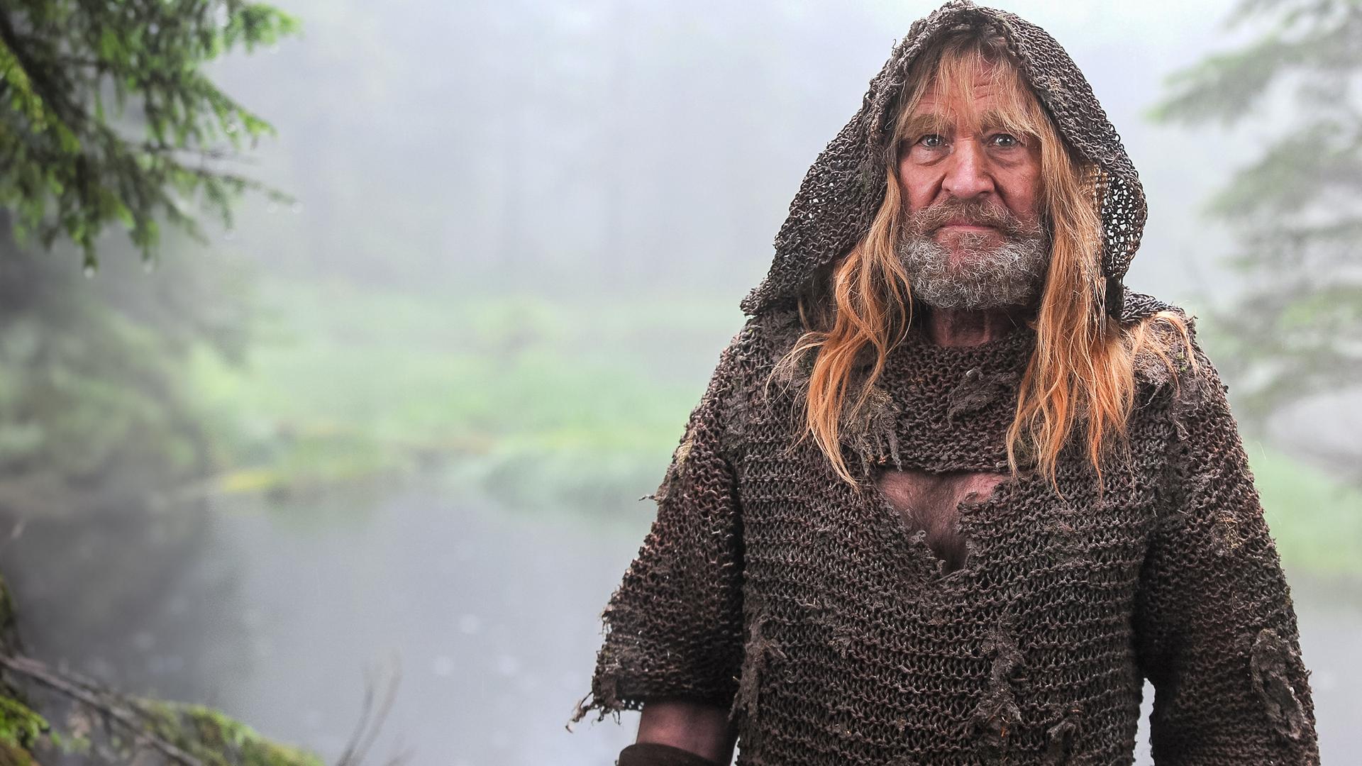 Vor dem Hintergrund eines Waldsees, der in eine Wiese ausläuft steht der Eisenhans (Michael Mendl). Er trägt Bart, eine weite Kapuze über dem Kopf, hat lange, blonde Haare und trägt ein schmutzig-braun wirkendes Gewand.