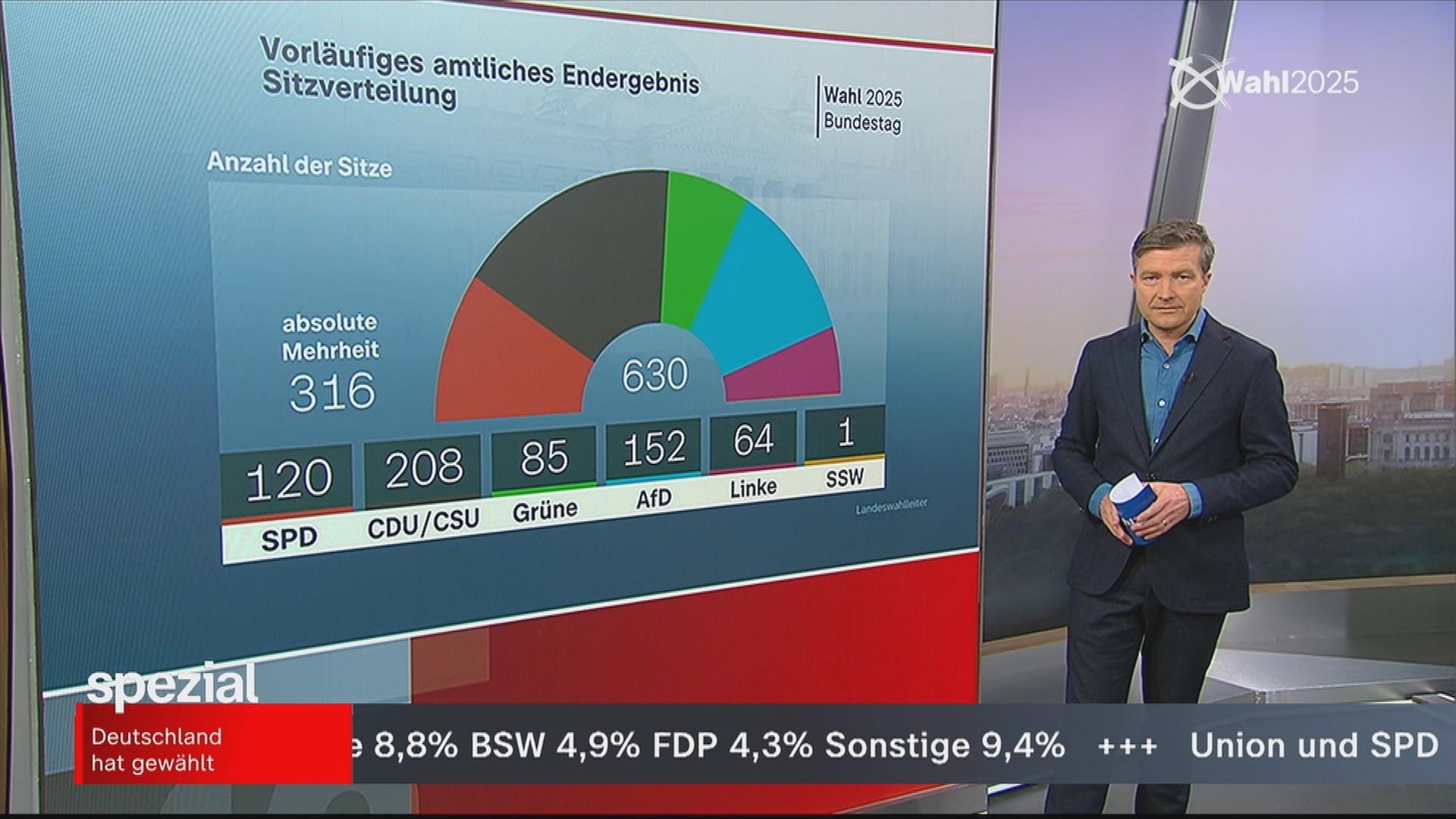 Am Tag der Bundestagswahl 2025 melden sich Shakuntala Banerjee und Stefan Leifert mit Parteienforscher Karl-Rudolf Korte von der Forschungsgruppe Wahlen e.V. Mannheim ab 17.00 Uhr live aus dem Futurium in Berlin, präsentieren regelmäßig die neuesten Zahlen und Analysen zu den Wahlergebnissen und sprechen mit Parteienvertretern und Fachleuten. Zwischendurch berichten heute und heute-journal. Um 20.15 läuft die ZDF/ARD Berliner Runde mit den Parteivorsitzenden bzw. Spitzenkandidaten der im Bundestag vertretenen Parteien und um 22.30 Uhr sendet das ZDF ein maybrit illner spezial Deutschland nach der Wahl. Der ZDF-Wahlabend ist auch online erlebbar: In der ZDFmediathek, auf ZDFheute.de und in der ZDFheute-App sind jederzeit alle Informationen, Statements von Bundes- und Landespolitikern, aktuelle Prognosen und Hochrechnungen abrufbar. Auf facebook.com/ZDFheute/ und Instagram /zdfheute/ werden die Stimmen der Wahlgewinner und -verlierer gesammelt, dazu können Nutzerinnen und Nutzer in Erklärgrafiken die Analyseergebnisse der Forschungsgruppe Wahlen einsehen.