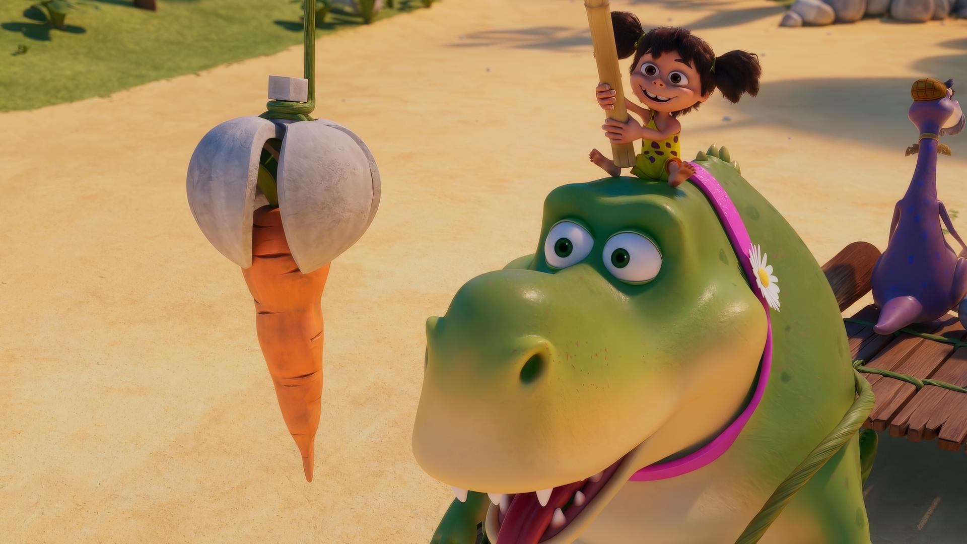 Die neueste Erfindung von Minus Drei ist bahnbrechend: das Rexie-Mobil! Eine Art Taxi, bei dem ein Tyrannosaurus einen Karren zieht.