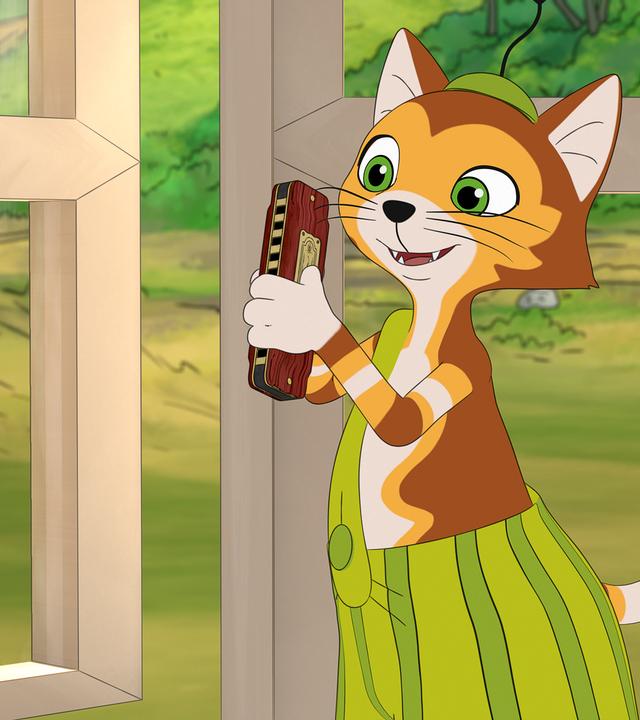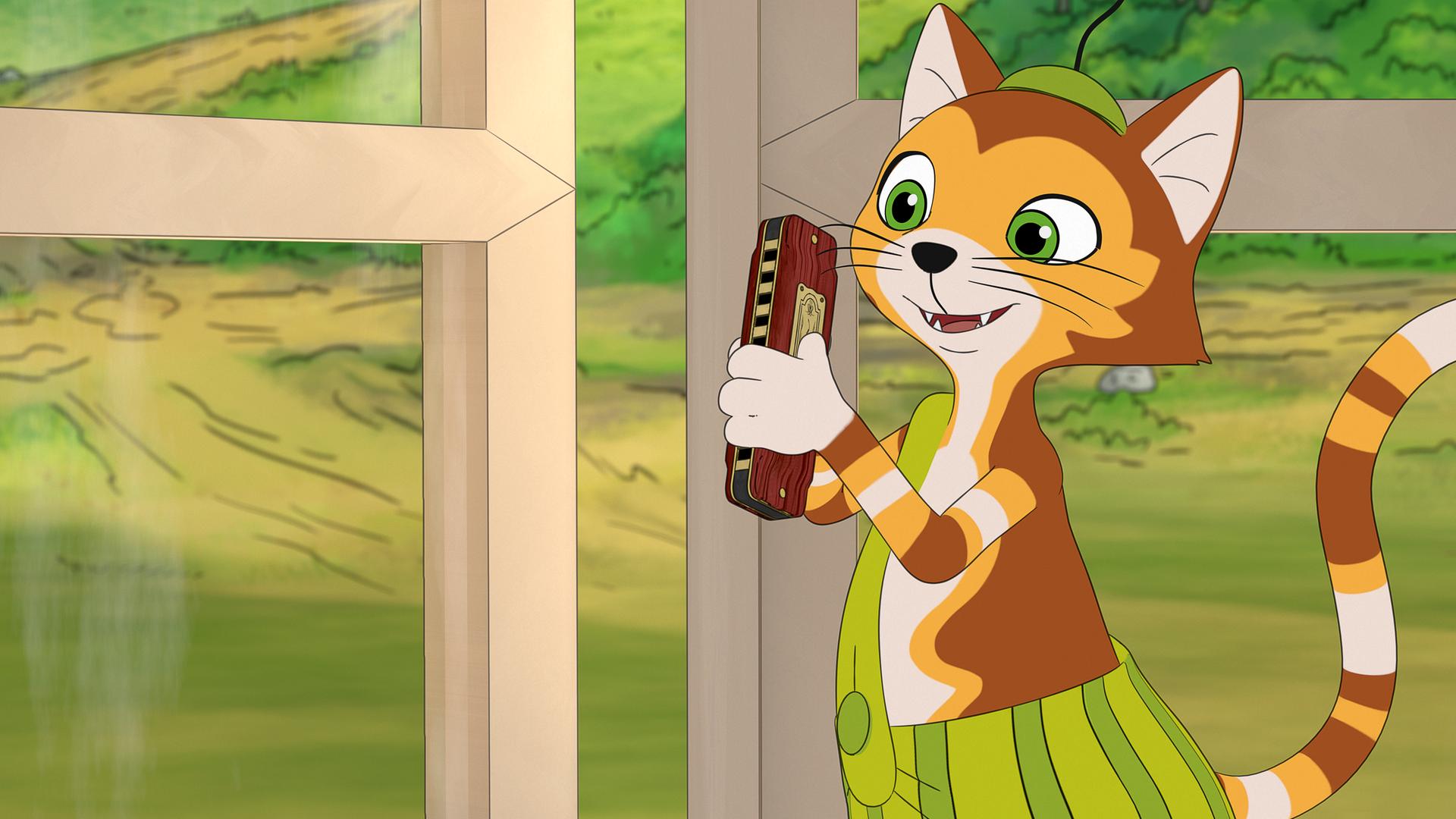 Findus langweilt sich. Um keine miese Stimmung aufkommen zu lassen, vertraut ihm Pettersson seine alte Mundharmonika an, mit der der kleine Kater ein bisschen spielen darf.