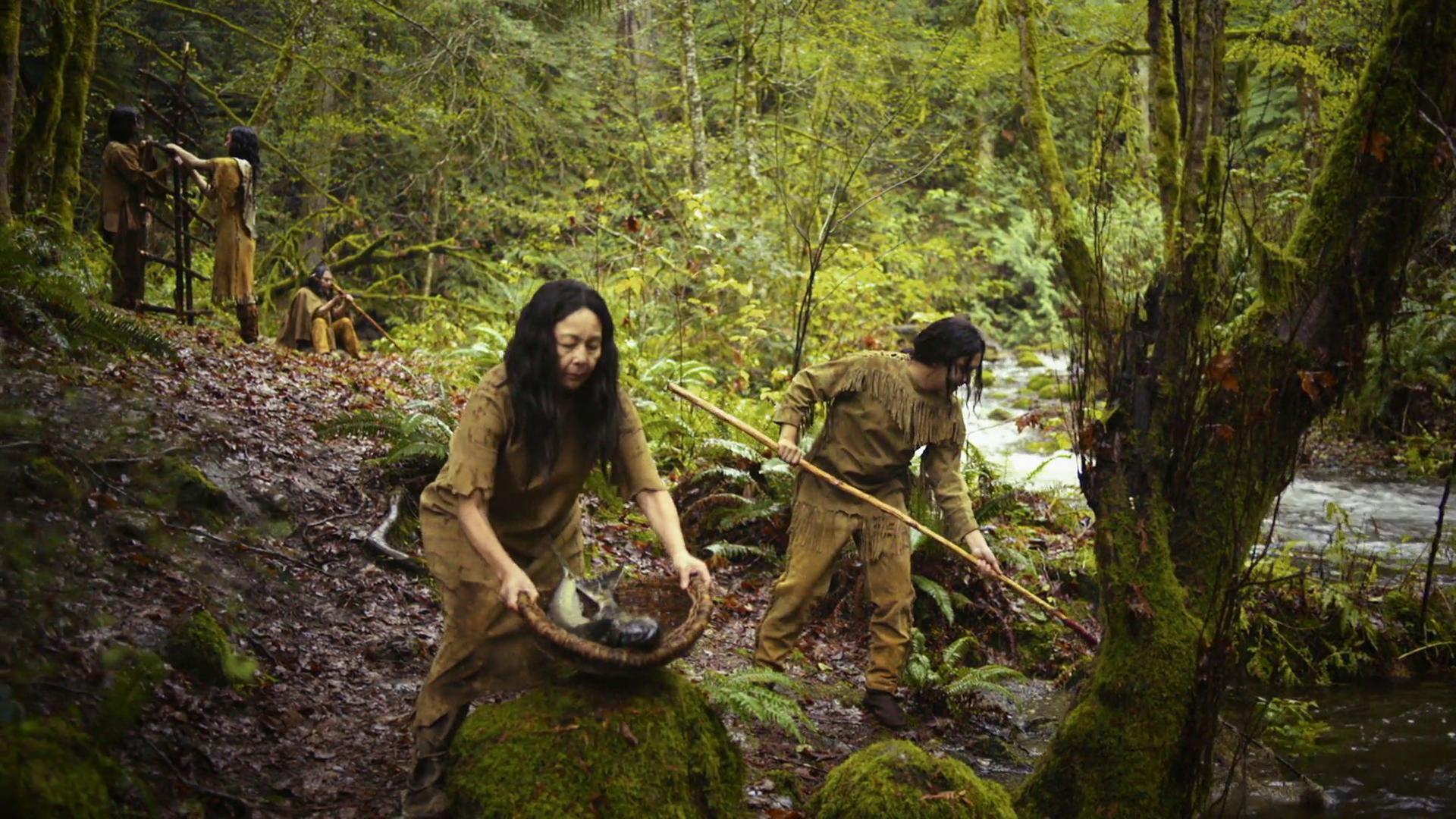 "1491 - Amerika vor Kolumbus: Jäger und Bauern": Szene im Wald am Rande eines Bachs - Im Vordergrund ist eine indigene Frau mit einem Fisch in einem Korb zu sehen, während im Hintergrund des Bildes drei weitere Menschen fischen, Flöte spielen oder eine Art Holzgerüst bauen.