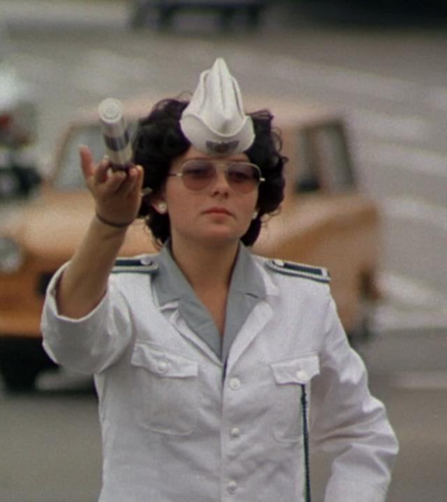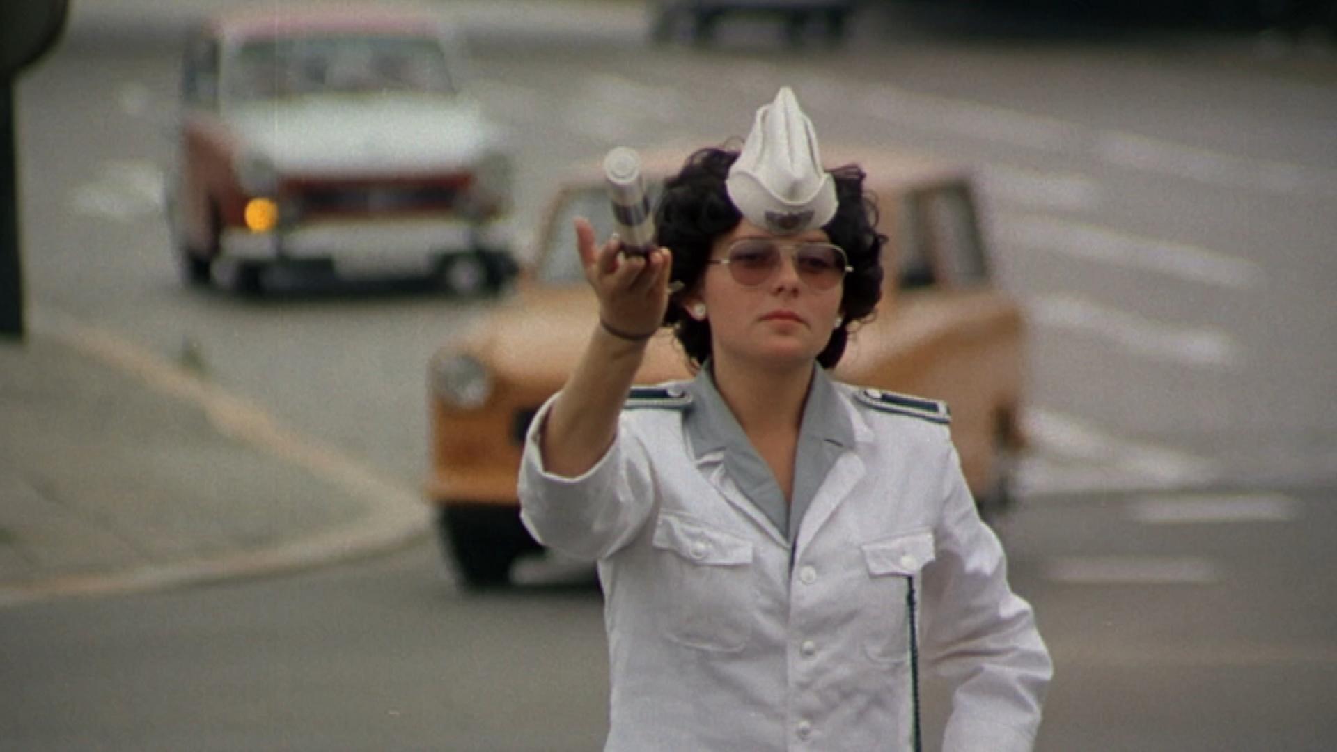 "Berlin, Berlin - Kripo, Vopo, Freund und Helfer": Polizistin in Ost-Berlin, zirka 1980, regelt auf der Straße den Verkehr.