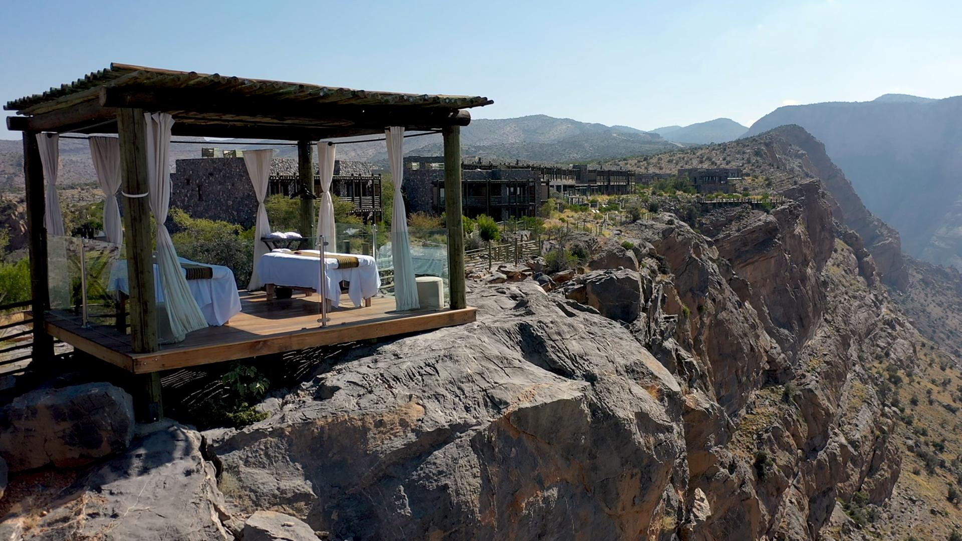 Hoch über dem Talboden an einer Bergspitze steht eine Luxushotelanlage, das "Alila Jabal Akhdar Resort" in Oman. Es ist nur mit einem Geländewagen zu erreichen, was die Betreiber vor logistische Herausforderungen stellt. Die Gäste erwarten hier Villen, Pools und Spas mit Rundumblick auf die Berge.