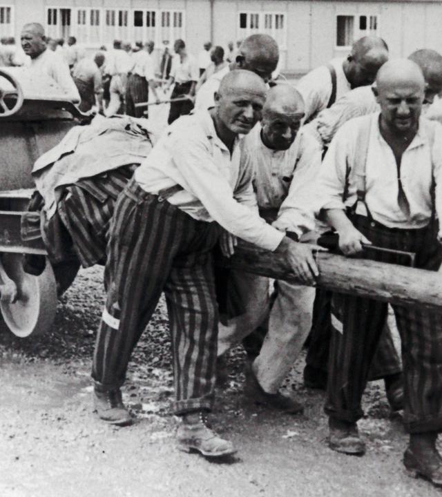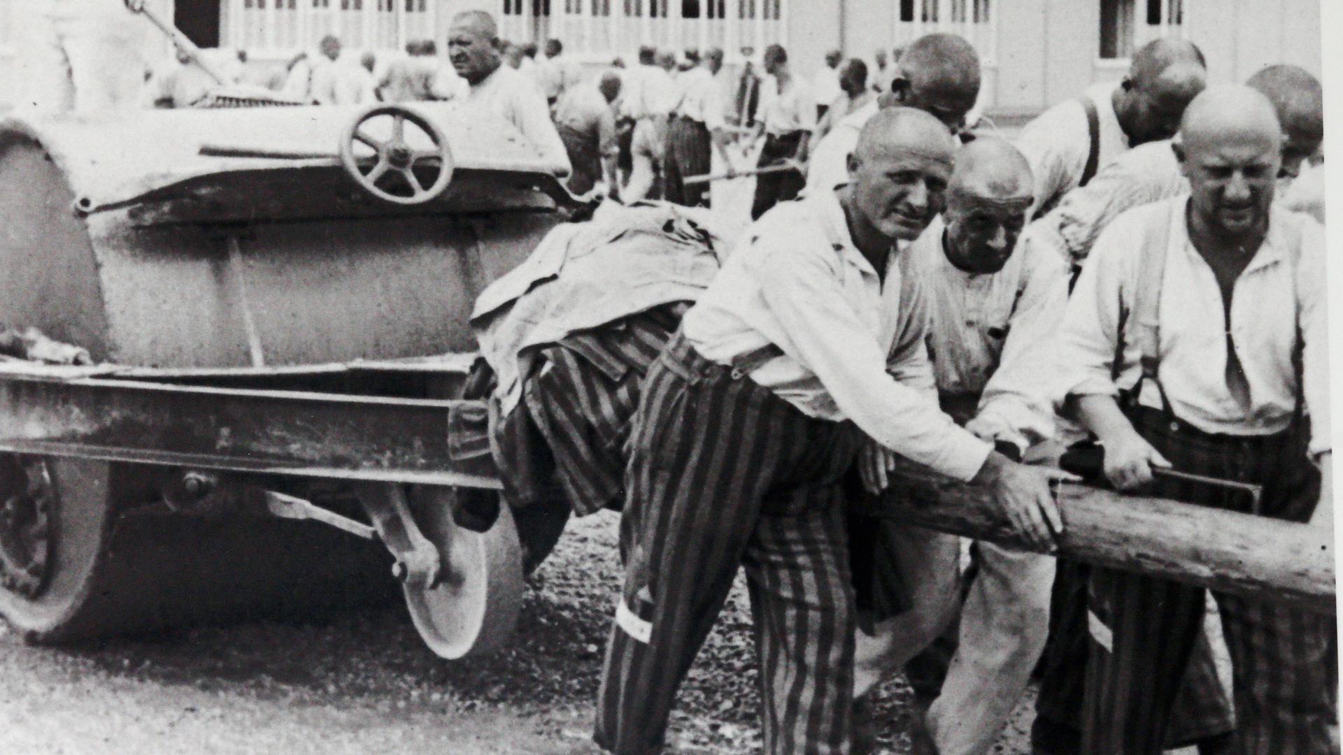 "Hitlers Sklaven - Die Geschichte der NS-Zwangsarbeiter - Ausbeutung": Schwarz-Weiß-Foto. Das Bild zeigt Häftlinge aus dem KZ Dachau beim Ziehen einer Straßenwalze.