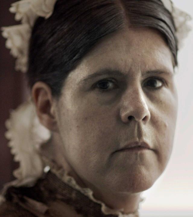 Nachgestellte Szene: Eine Frau mit einer Rüschenhaube auf dem Kopf schaut von der Seite in die Kamera.