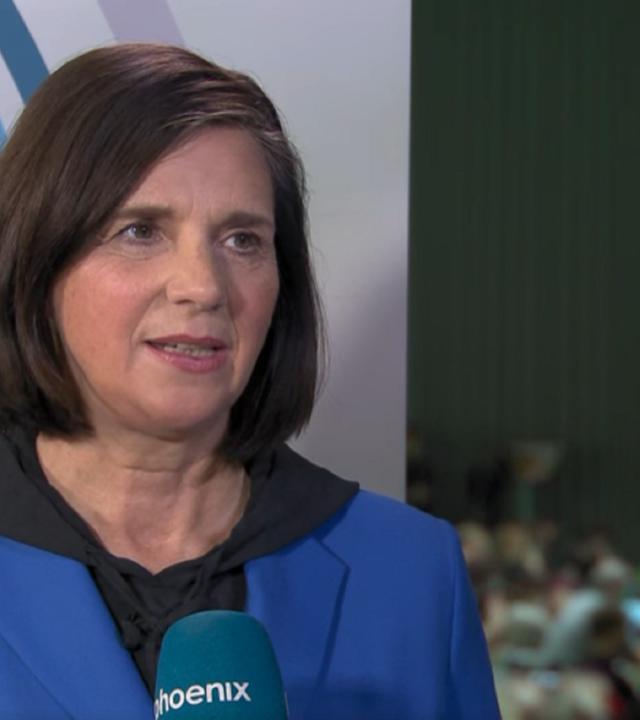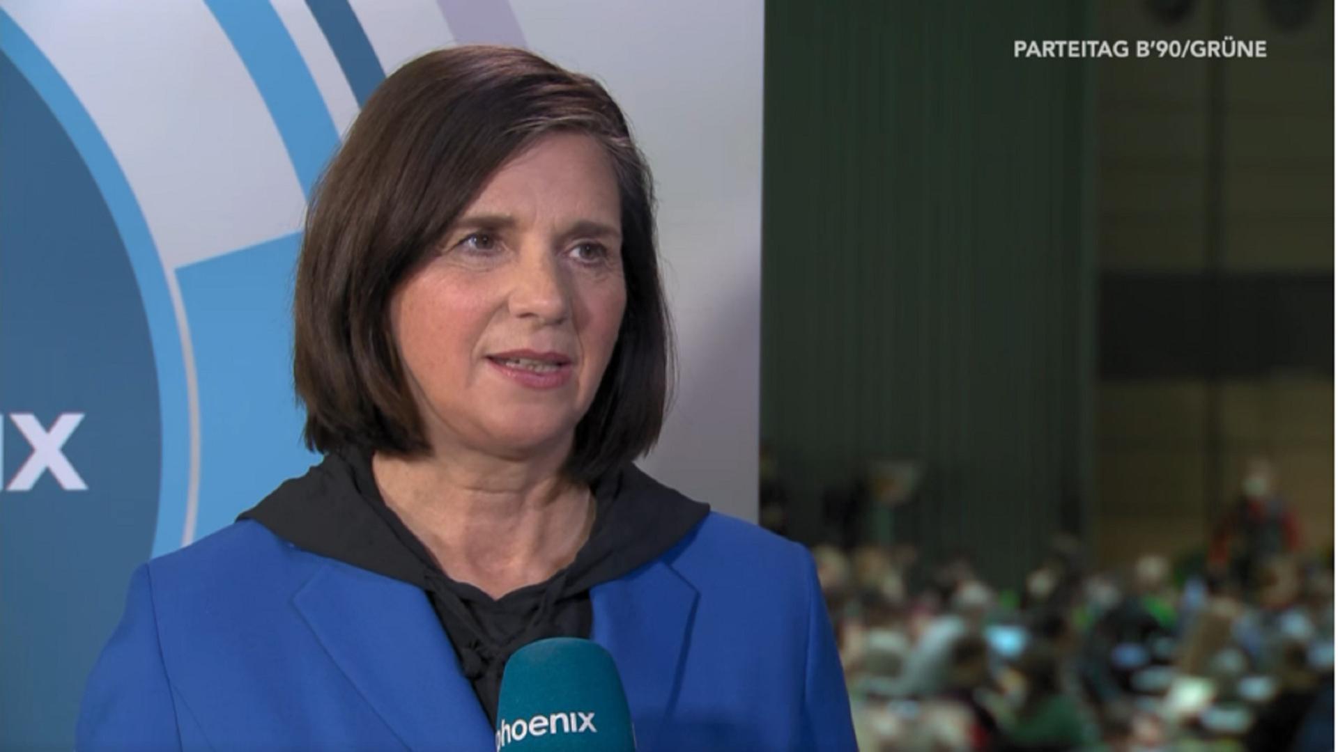 Katrin Göring-Eckhardt (B'90/Grüne) im Gespräch mit phoenix-Reporter Marc Steinhäuser auf dem Parteitag der Grünen am 14.10.2022