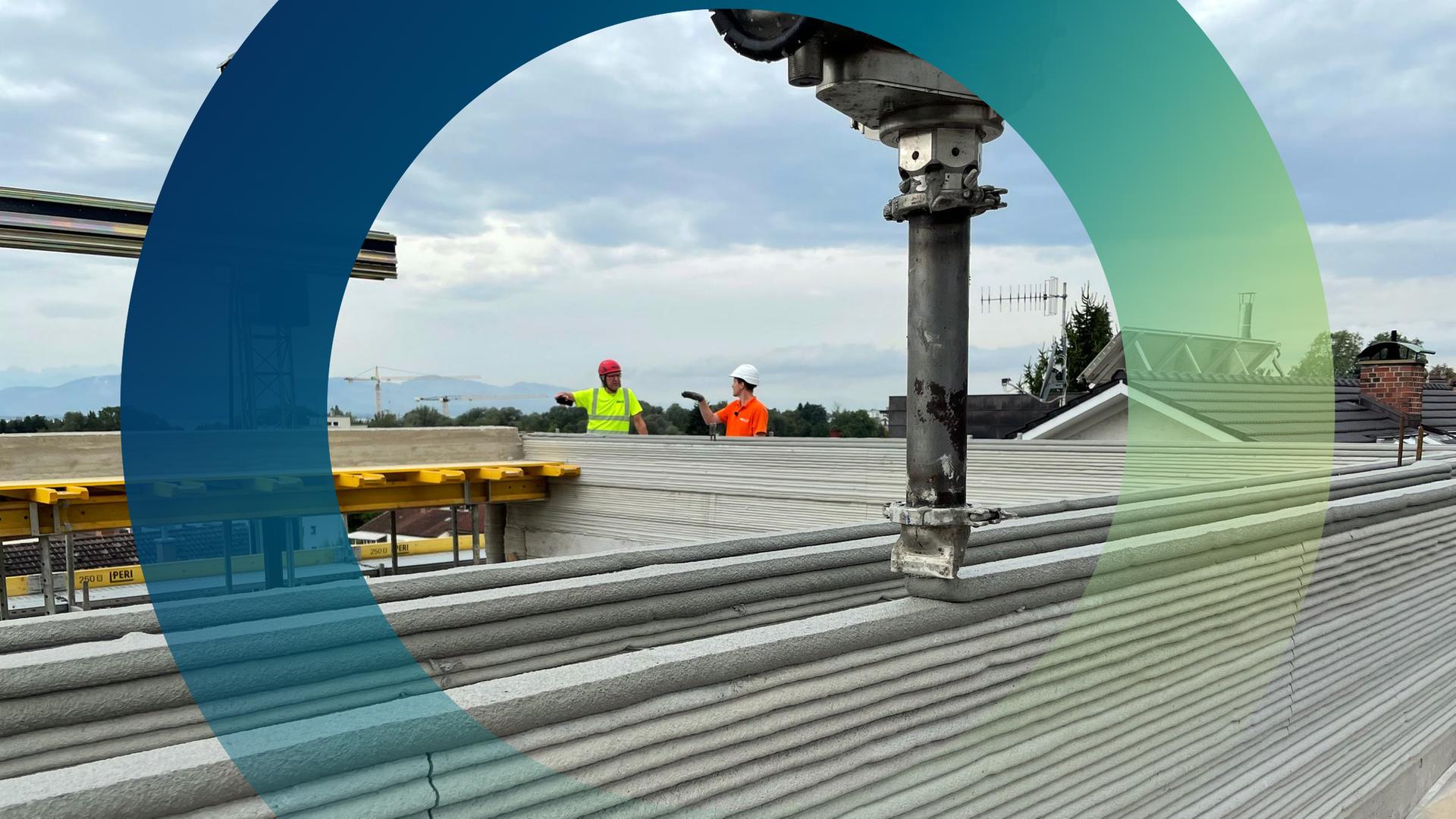 Drei Personen auf der Baustelle, ein Laptop, ein Betonmischer, ein Druckkopf, der auf Schienen hin und her saust: Prototyp einer Baustelle der Zukunft. Rohbauzeit für ein Einfamilienhaus: nur zehn Tage.