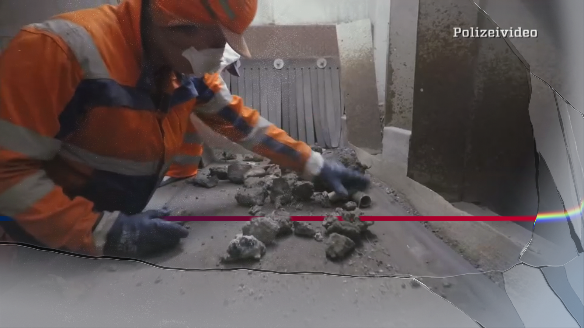 Ein Mann in orangener Sicherheitskleidung und Schutzmaske sortiert Müll an einem Fließband.