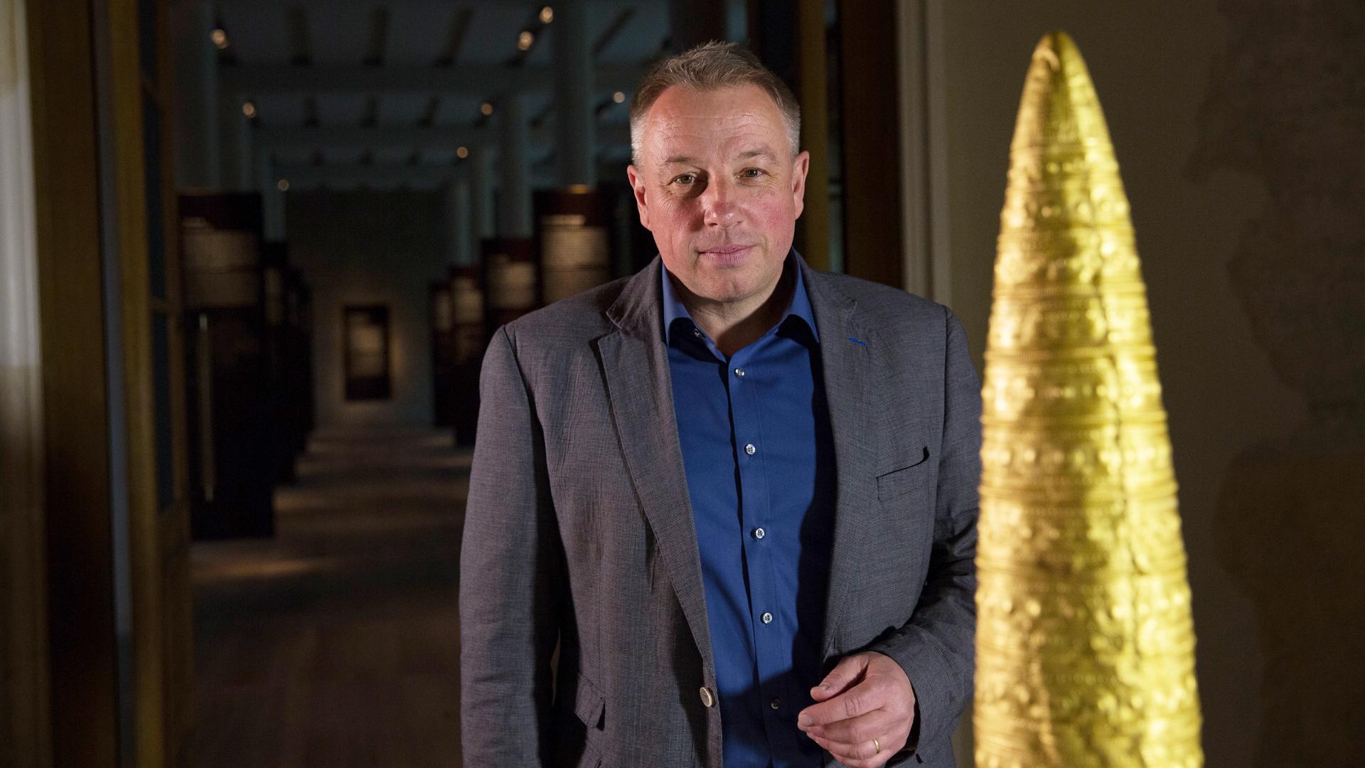 Matthias Wemhoff mit Goldhut im Neuen Museum Berlin