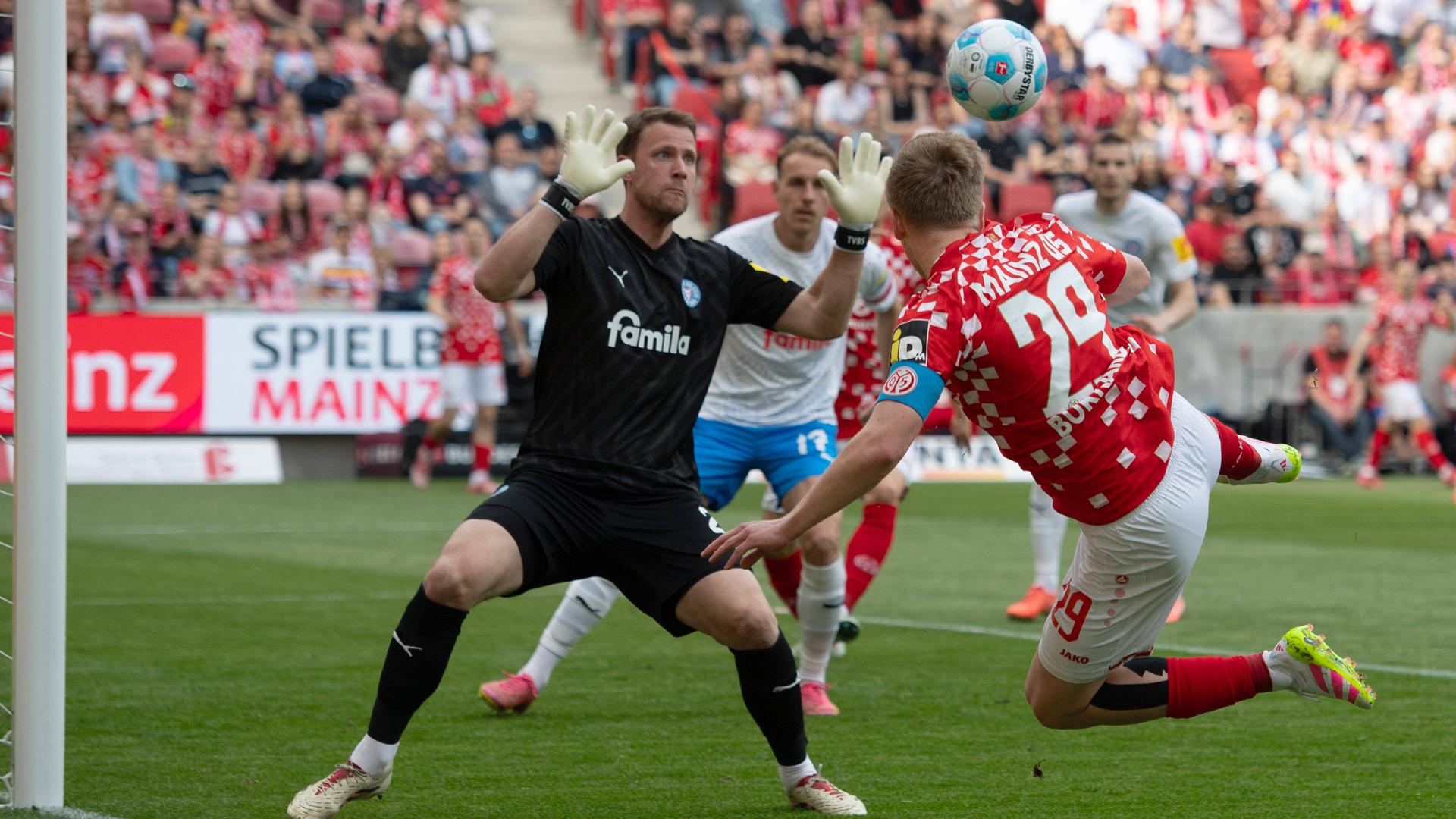 Obwohl Mainz durch Jonathan Burkardt früh zu einer guten Chance kam (3.), versteckten sich die Norddeutschen keineswegs. In der 10. Minute war es einzig der glänzenden Beinabwehr vom Mainzer Keeper Robin Zentner zu verdanken, dass der freistehende Lasse Rosenboom nicht zur Gästeführung traf. Die 32.500 Fans sahen ein munteres Fußballspiel zweier offensiv ausgerichteter Mannschaften - und in der 19. Minute die nächste Großchance, als Burkardt für die Nullfünfer am Pfosten scheiterte.