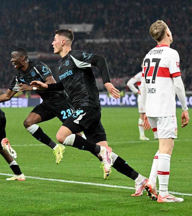 Dank großer Moral, einer furiosen Aufholjagd und später Tore hat Bayer Leverkusen den Rückstand auf Tabellenführer FC Bayern München in der Fußball-Bundesliga verkürzt. Angreifer Patrik Schick schoss den Meister beim VfB Stuttgart in der Nachspielzeit nach 1:3-Rückstand noch zum 4:3 (0:1)-Sieg und ließ die Werkself jubeln.