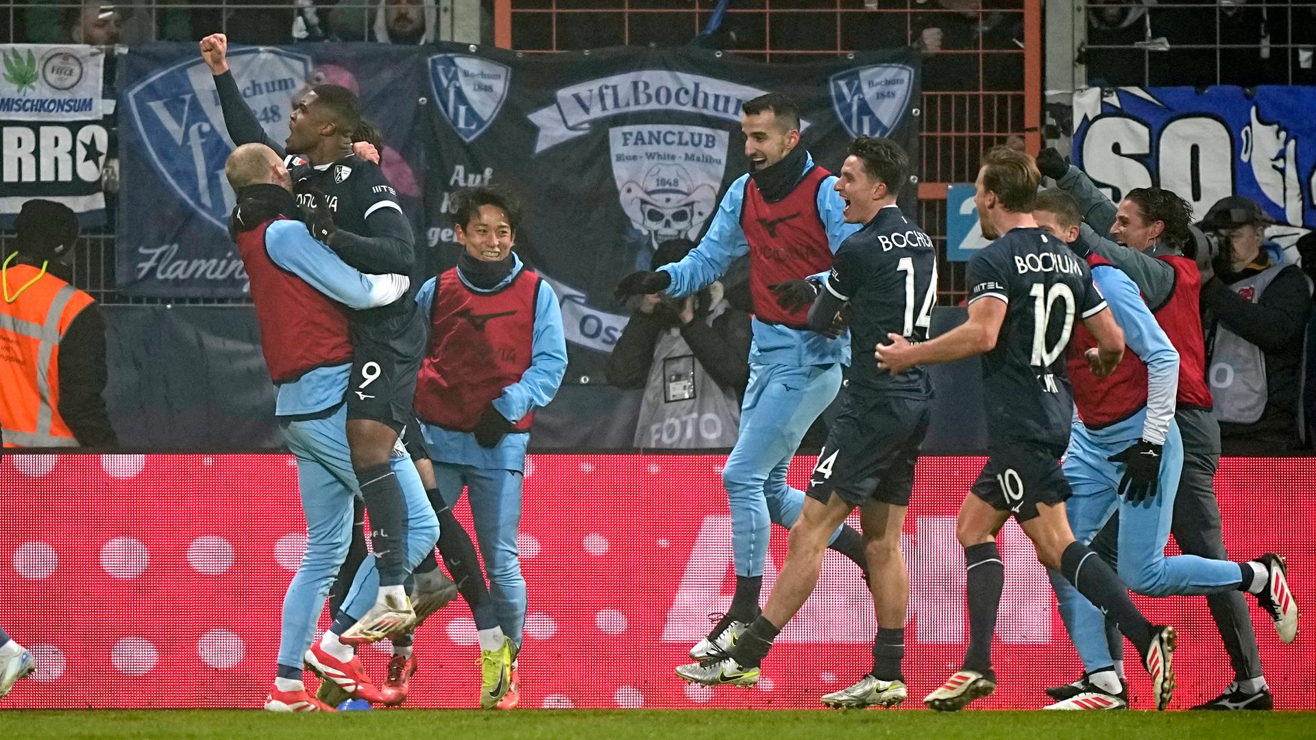 Bochums Myron Boadu jubelt mit seiner Mannschaft nach seinem Ausgleichstreffer gegen Leipzig.