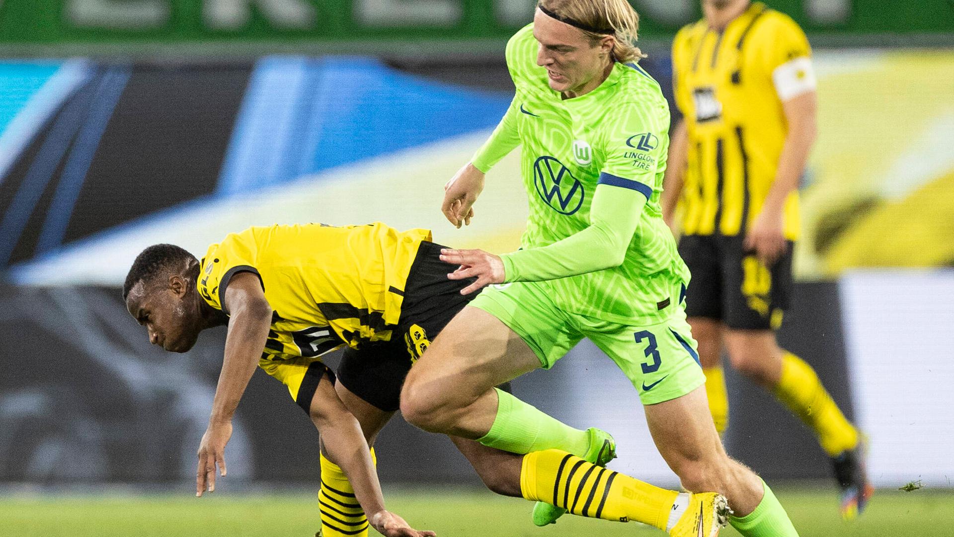 Donyell Malens strammer Schuss von halblinks wurde von Wolfsburgs Schlussmann Koen Casteels gerade noch so um den linken Pfosten gelenkt (21.) und Youssoufa Moukokos Schuss nach Ballgewinn von Jude Bellingham wurde von van de Ven in letzter Sekunde ins Toraus abgefälscht (22.). Auf der anderen Seite hätte der völlig freistehende Jakub Kaminksi die Führung für Wolfsburg - wieder aus einer Standardsituation heraus - ausbauen können, doch Raphael Guerreiro klärte den Ball noch knapp vor der Torlinie (32.).