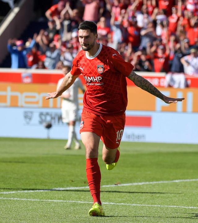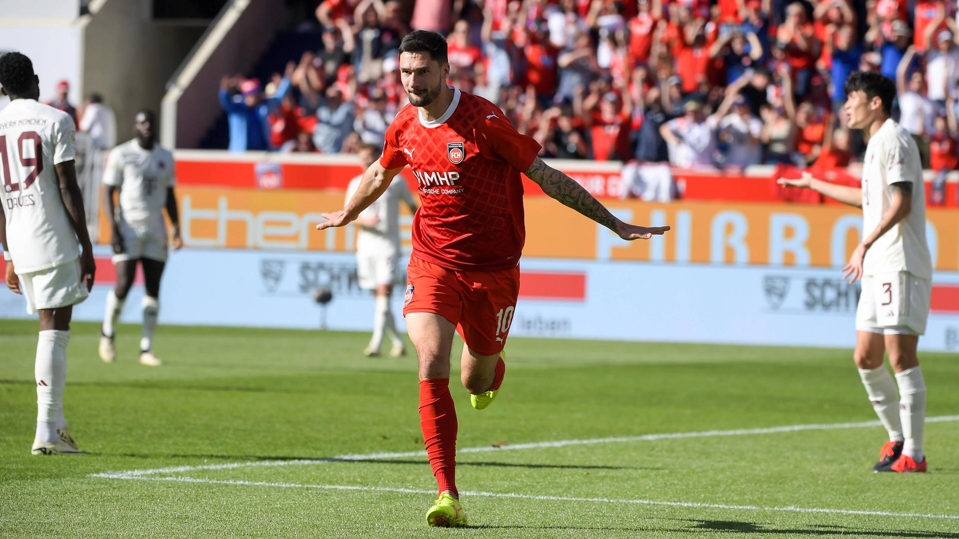Tim Kleindienst (1. FC Heidenheim) bejubelt sein Tor gegen Bayern München.
