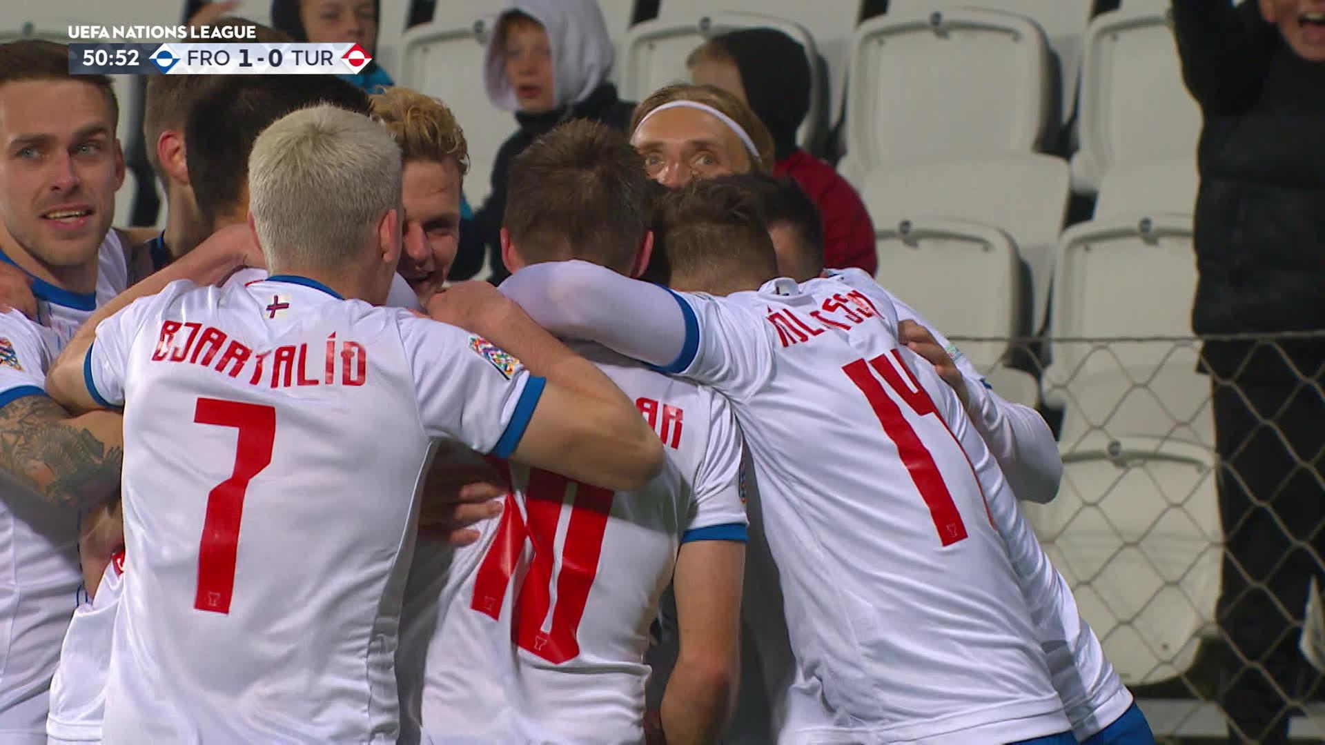 Die Färöer haben das Nations-League-Spiel gegen die Türkei 2:1 gewonnen. Viljormur Davidsen (51.) und Joan Simun Edmundsson (59.) brachten den Außenseiter in Führung. Serdar Gürler traf in der 89. Minute zum 2:1 Anschlusstreffer. Schon vor der Partie stand die Türkei als Gruppenerster und Aufsteiger in die Liga B fest. Auch für die Färöer war der Klassenerhalt bereits sicher.