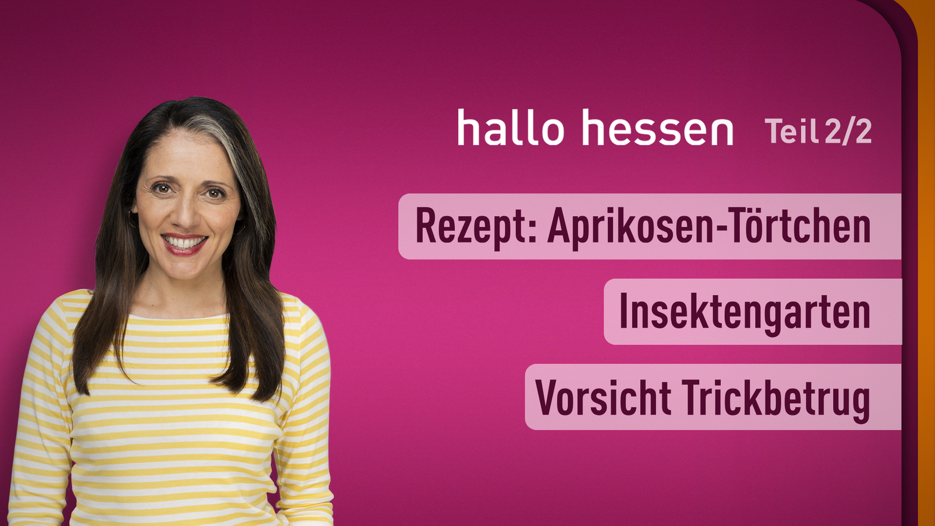 Es gibt viele nützliche Insekten, die in keinem Garten fehlen sollten. Wir zeigen mit welchen Pflanzen und Methoden Sie Marienkäfer und andere Nützlinge in den Garten locken. Und wir backen Aprikosen-Marzipan-Törtchen mit Mürbteig. Und zusammen mit der Polizei klären wir über aktuelle Betrugsmaschen wie zum Beipsiel falsche Bankmitarbeiter auf.