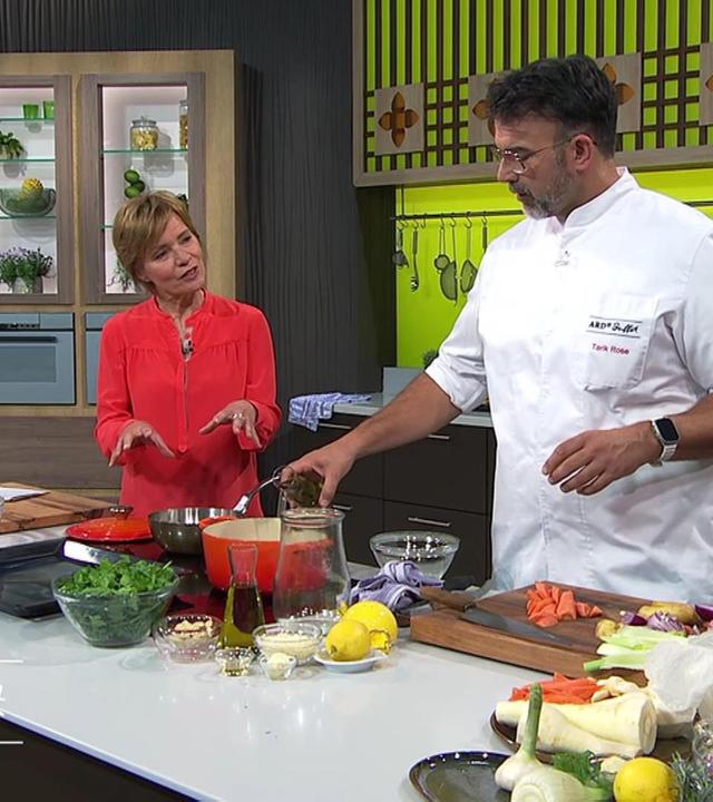 Rezept: Antipasti norddeutsch mit Petersilien-Pesto von Tarik Rose - Talk: Geraldine Schüle und Patrick Ortlieb: Leben auf einem 500 Jahre alten Bauernhof - einfach genial: Nussknacker. Mit Patrick Ortlieb, Zimmermann