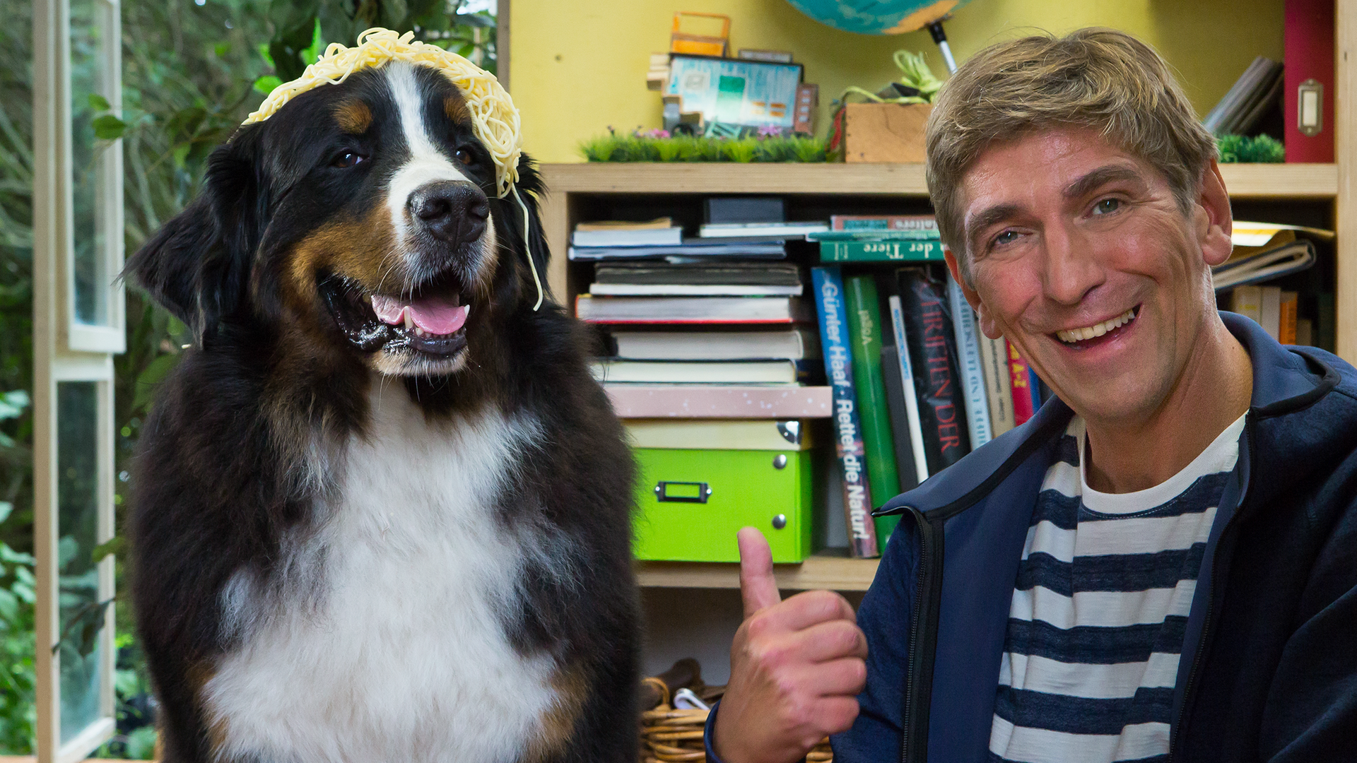 Fritz Fuchs sitzt mit Keks, der Spaghetti auf dem Kopf hat, vor dem Bauwagen