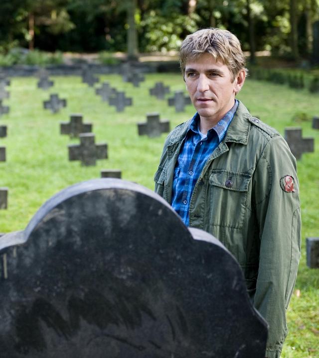 Fritz und eine Gärnterin stehen auf dem Friedhof vor einem Grabstein.
