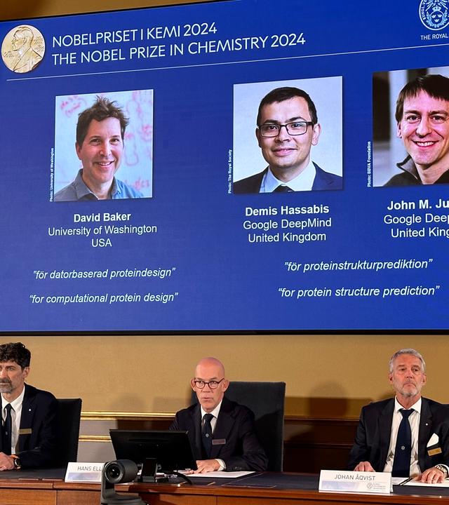 Der Nobelpreis für Chemie geht in diesem Jahr zur Hälfte an den US-Biochemiker David Baker sowie an die KI-Forscher Demis Hassabis und John Jumper. Sie werden für ihre Arbeiten zum "computergestützten Proteindesign" sowie für die "Vorhersage von Proteinstrukturen" ausgezeichnet.