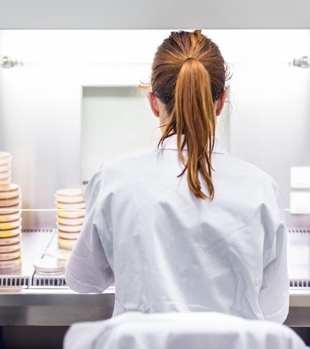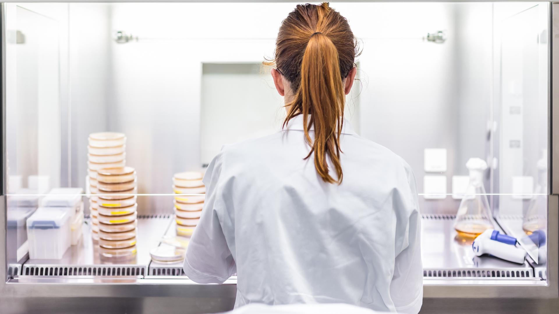 Wissenschaftlerin - von hinten zu sehen - bei Arbeiten im Labor.