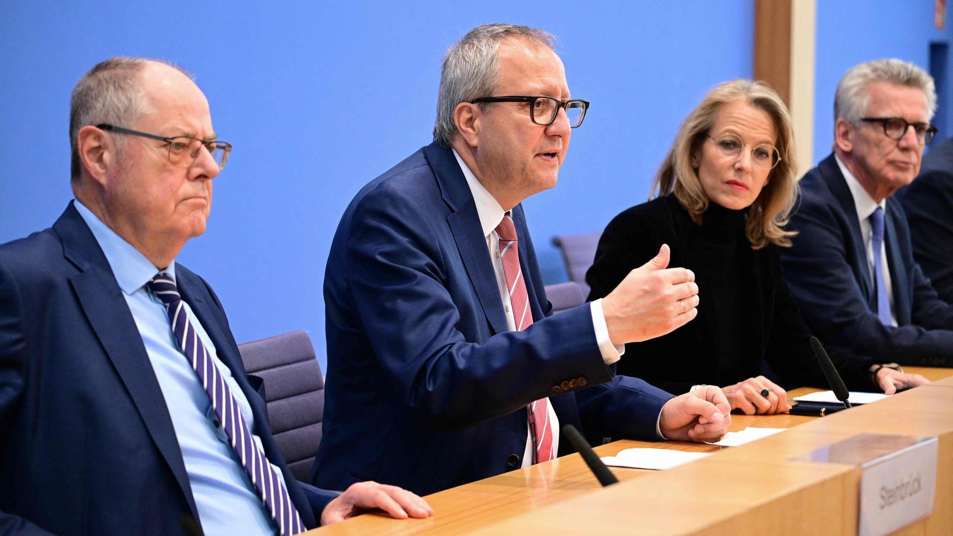 Pressekonferenz zur Initiative für einen handlungsfähigen Staat mit Julia Jäkel (Medienmanagerin, Aufsichtsrätin), Thomas de Maizière (CDU, Bundesminister a.D.), Peer Steinbrück (SPD, Bundesminister a.D.) und Andreas Voßkuhle (ehemaliger Präsident des Bundesverfassungsgericht).