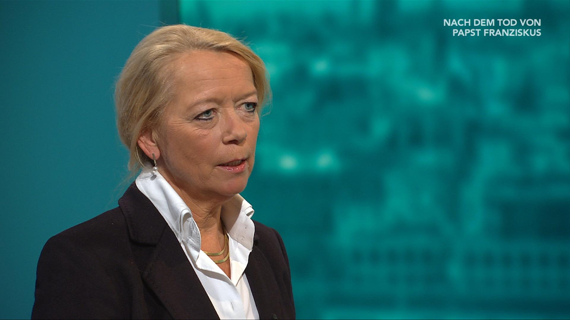 Studiogast Claudia Kaminski, Vatikanexpertin und Journalistin, mit Einordnungen zum Tod von Papst Franziskus