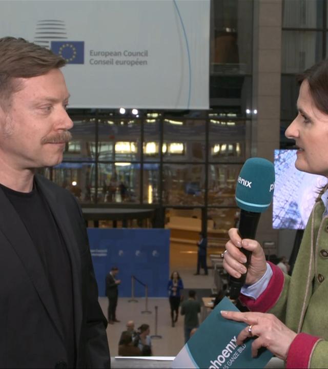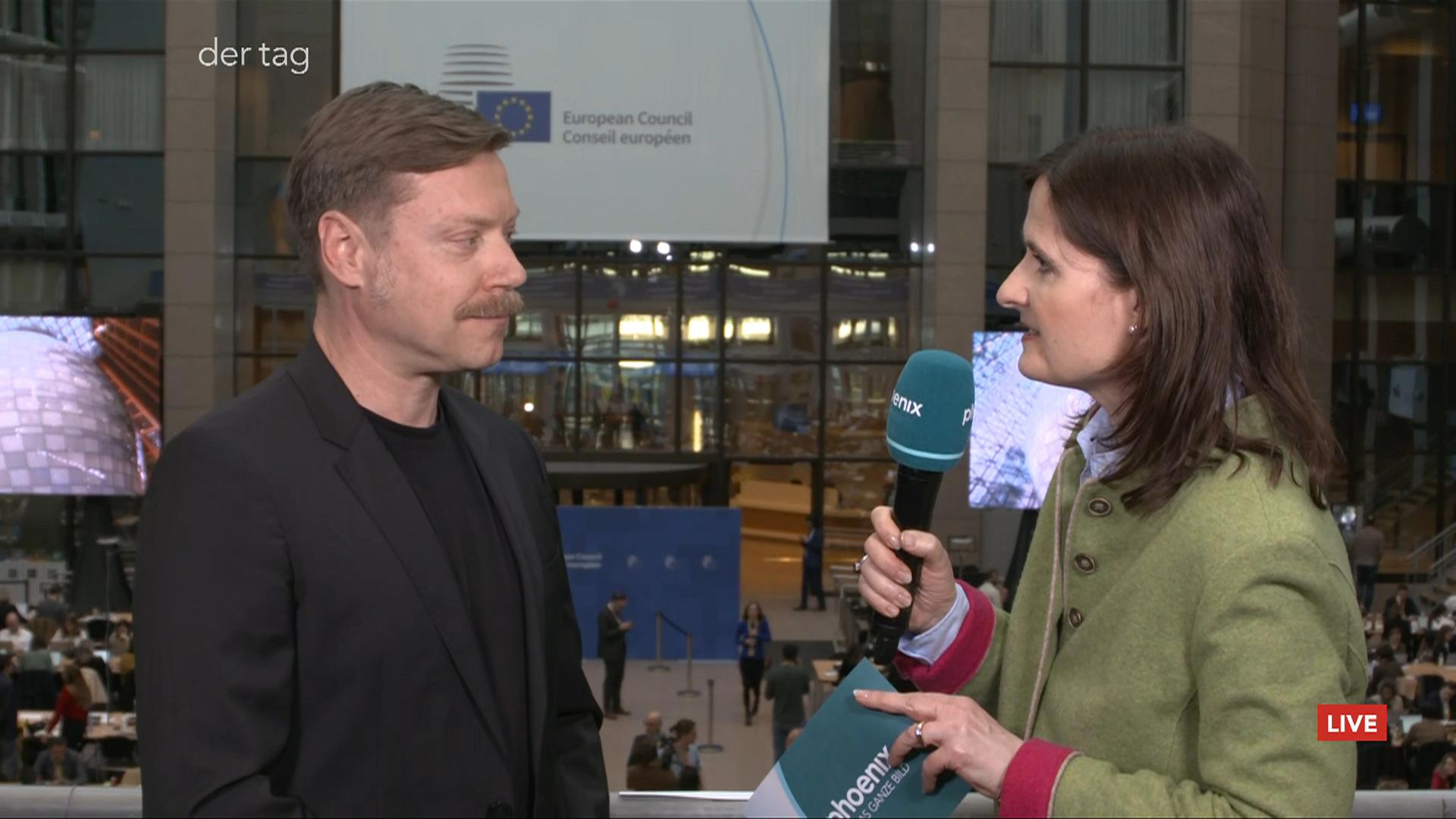 phoenix-Reporterin Ines Arland im Gespräch mit Martin Schirdewan (DIE LINKE, Ko-Fraktionsvorsitzender Europäische Linke) zum EU-Gipfel in Brüssel, phoenix der tag am 20.03.25