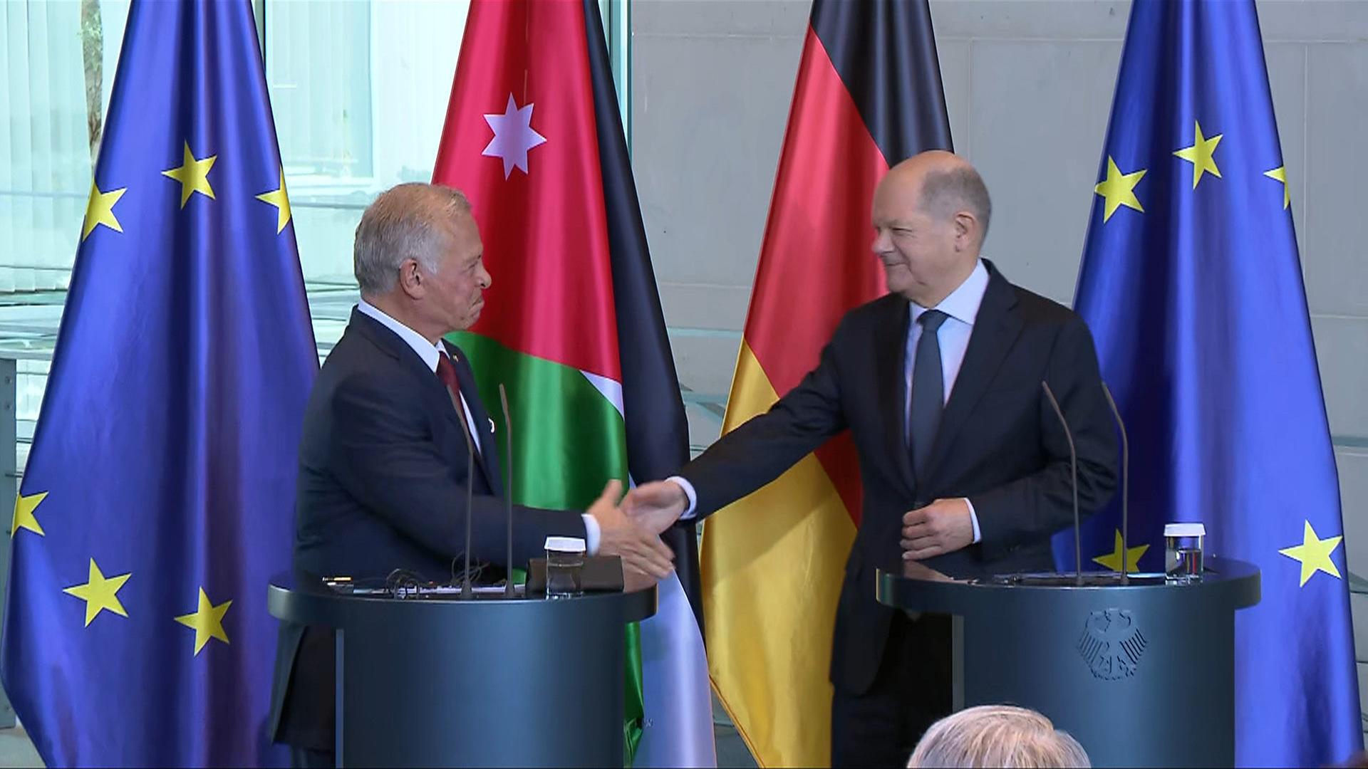 03.04.25 Pressekonferenz mit Olaf Scholz (SPD, geschäftsführender Bundeskanzler) zum Besuch des Königs des Haschemitischen Königreichs Jordanien, Abdullah II. Ibn Al-Hussein in Berlin