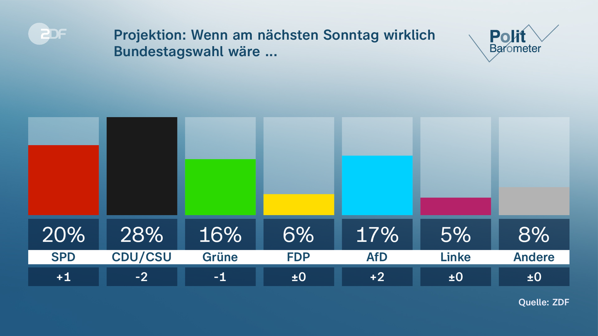 Wenn am nächsten Sonntag Bundestagswahl wäre, könnten SPD und AfD zulegen, während die Grünen leichte Verluste hinnehmen müssten. Das zeigt das aktuelle ZDF-Politbarometer.