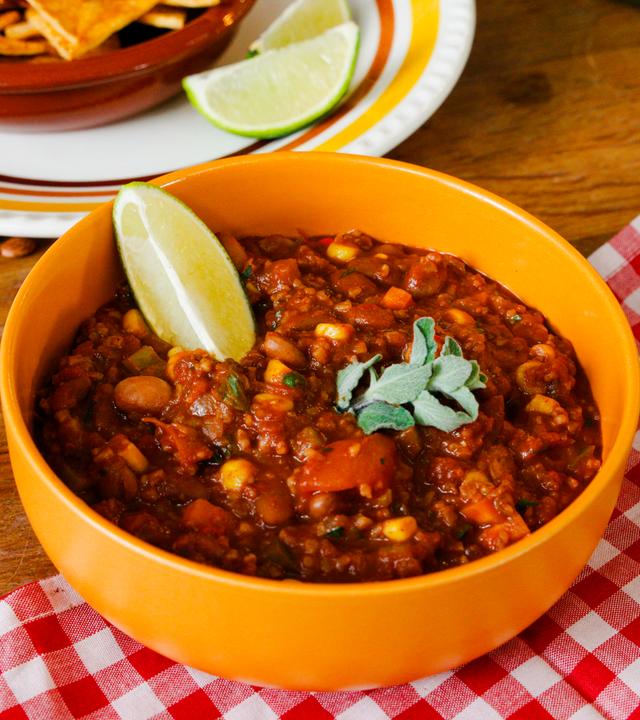 Mario Kotaska präsentiert eine vegane Alternative des mexikanischen Klassikers: Chili sin Carne. Das Ganze wird verfeinert mit Stückchen aus Zartbitterschokolade und serviert mit aromatischen Tortilla-Chips.