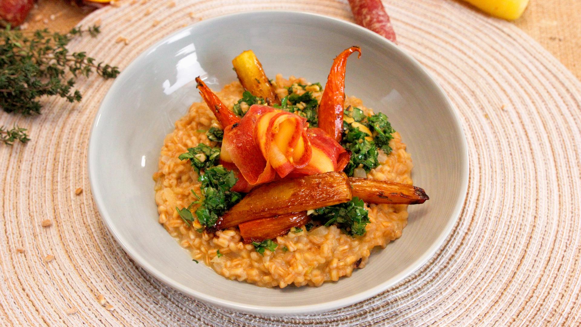 Aus Dinkel lässt sich genauso gut ein Risotto kochen wie aus Reis. Mario Kotaska serviert dazu eine Gremolata, eine italienische Gewürzmischung mit Kräutern, und geröstete Karotten als Gemüse-Crunch.