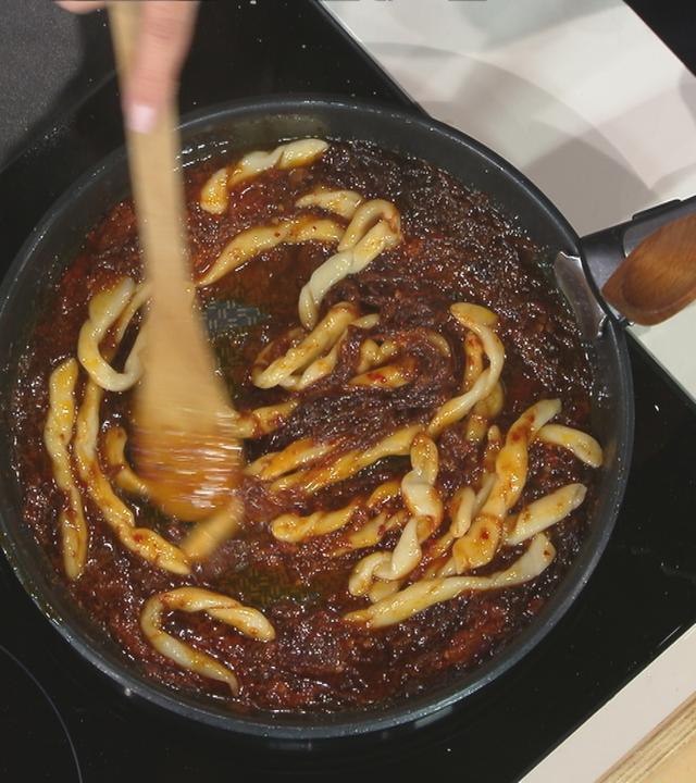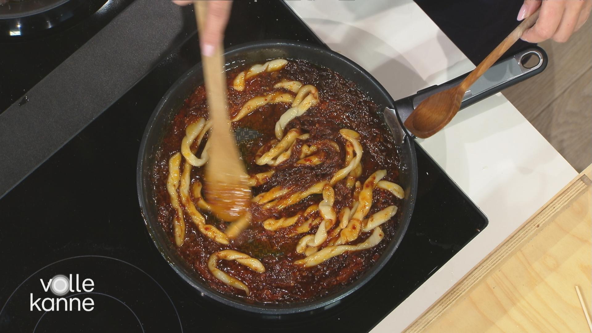 Stefania Lettini zaubert ein köstliches, kalabresisches Nudelgericht: Fileja. Im Originalrezept mit Zwiebeln aus Tropea und der Wurst Nduja. Sie können aber auch einfach Schalotten nehmen.