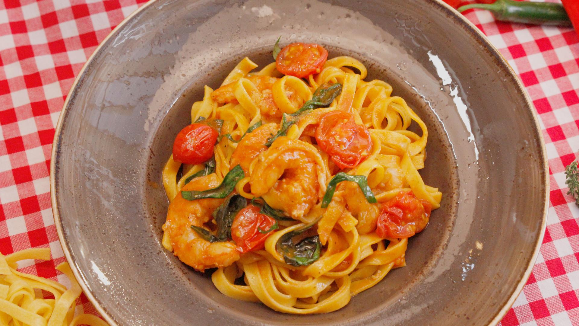 Das Rezept "Pasta mit Garnelen" von Mario Kotaska finden Sie hier zum Download.