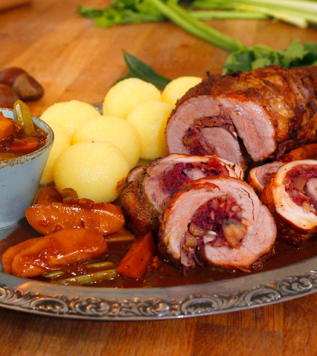 Der Rollbraten - aufwendig, aber ein Klassiker zur Weihnachtszeit. Für den besonderen Geschmack werden aromatische Gewürze, zarte Maronen und Äpfel in den Schmortopf gegeben.