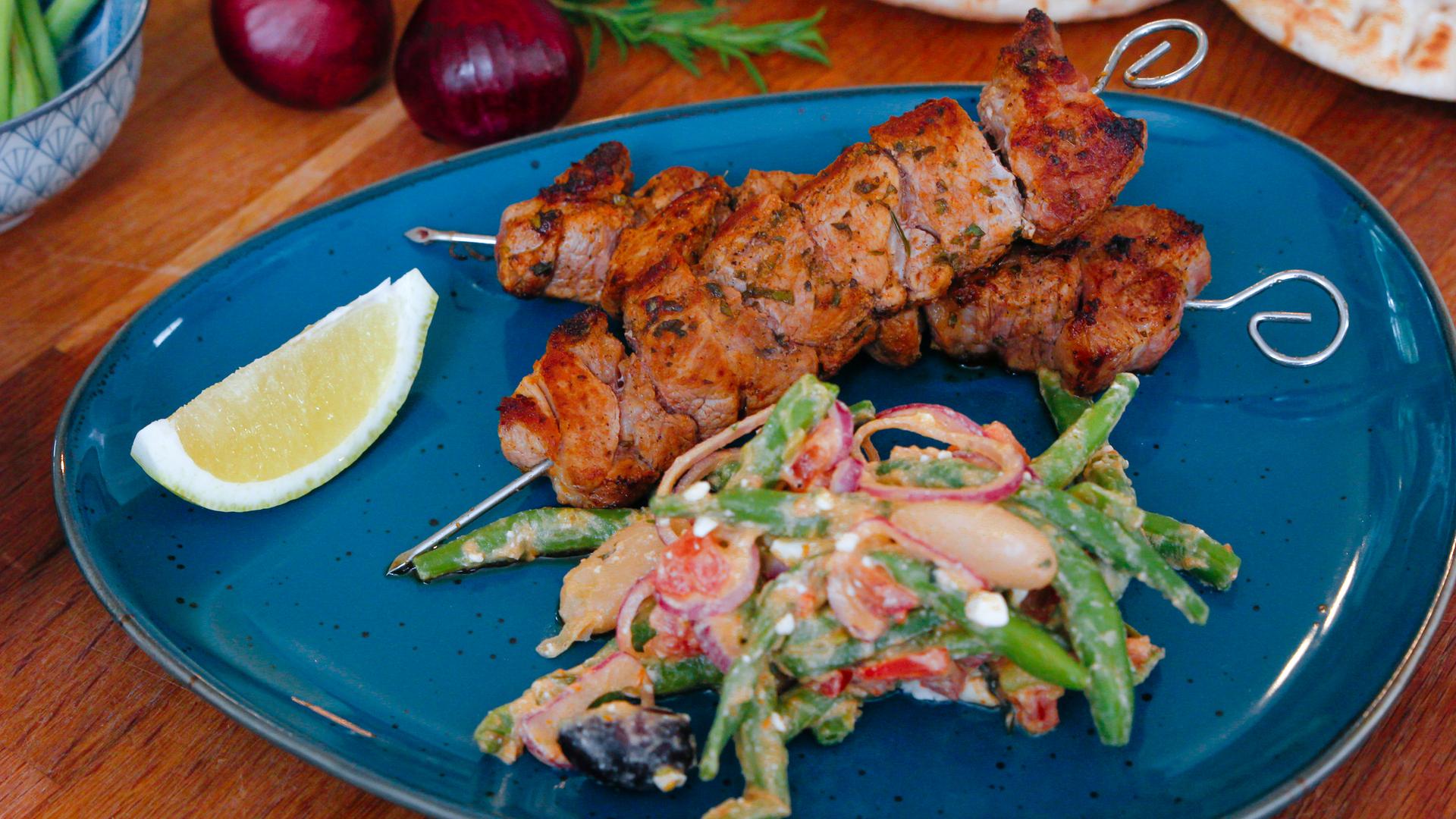 Die Grillspieße bringen Griechenland-Feeling nach Hause. Mario Kotaska serviert passend dazu einen mediterranen Bohnensalat aus grünen und weißen Bohnen.