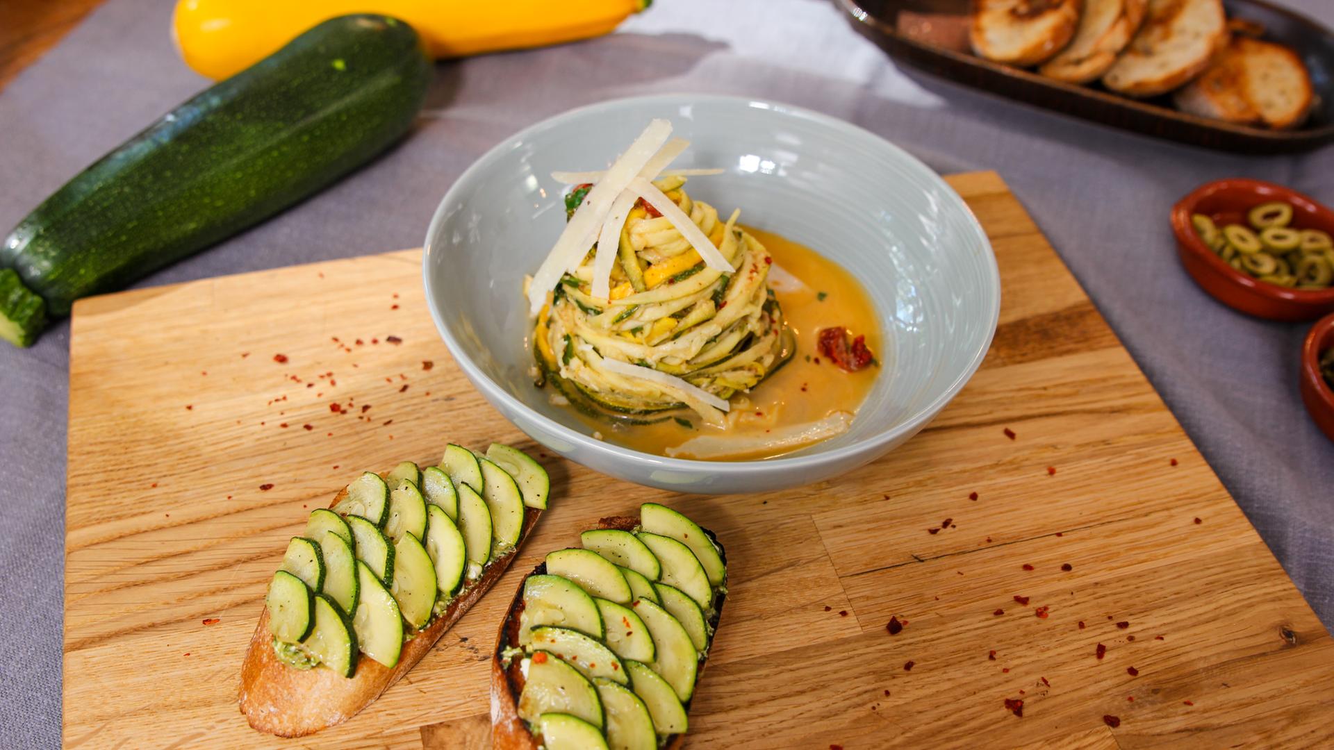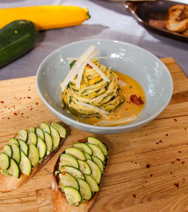 Mario Kotaska serviert einen Pasta-Klassiker mit feinen Zucchini-Julienne statt Spaghetti. Die frische Zitronennote wird ergänzt durch eine grüne Bruschetta-Variante mit Basilikum in Verbindung mit Oliven und Hüttenkäse.