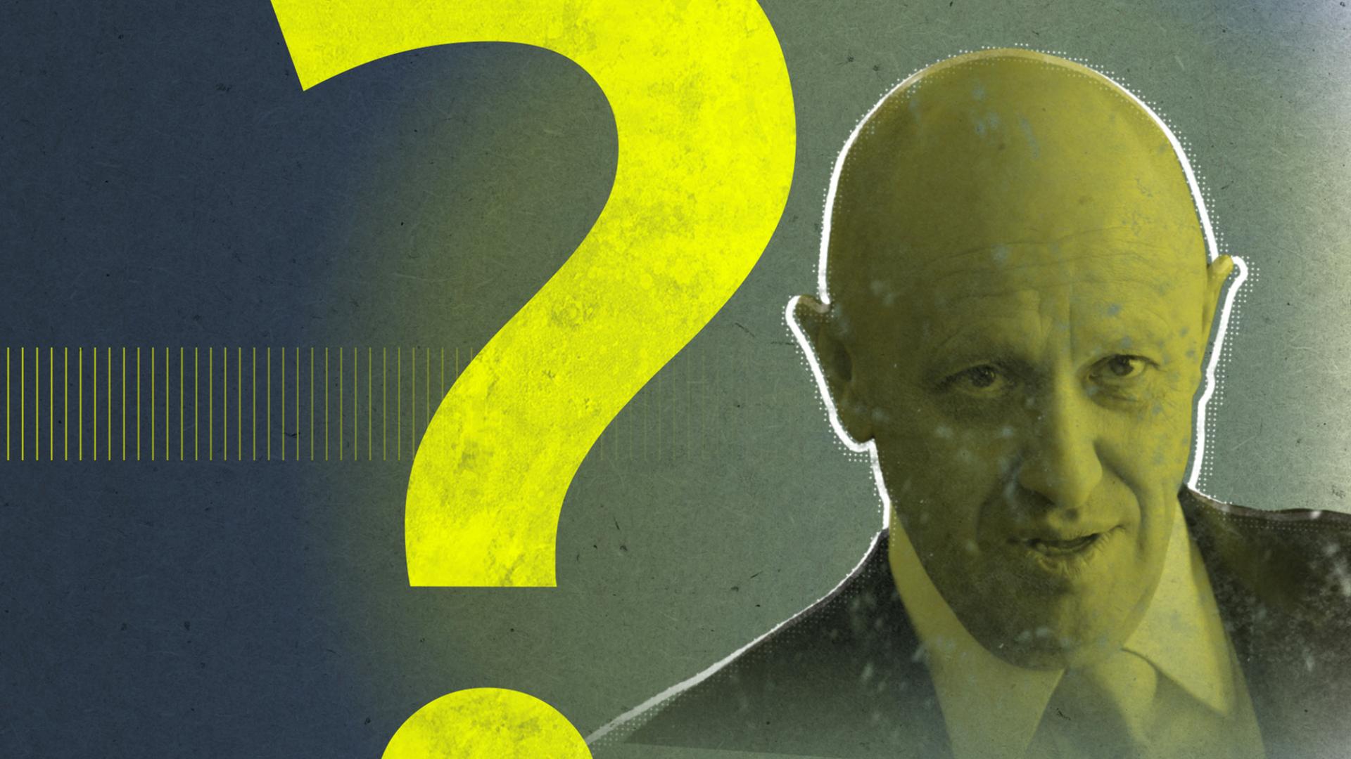Der Söldnerchef und Unternehmer Jewgeni Prigoschin schaut auffordernd in die Kamera, er ist neben einem großen Fragezeichen zu sehen. Das Foto ist schwarz-gelb eingefärbt.