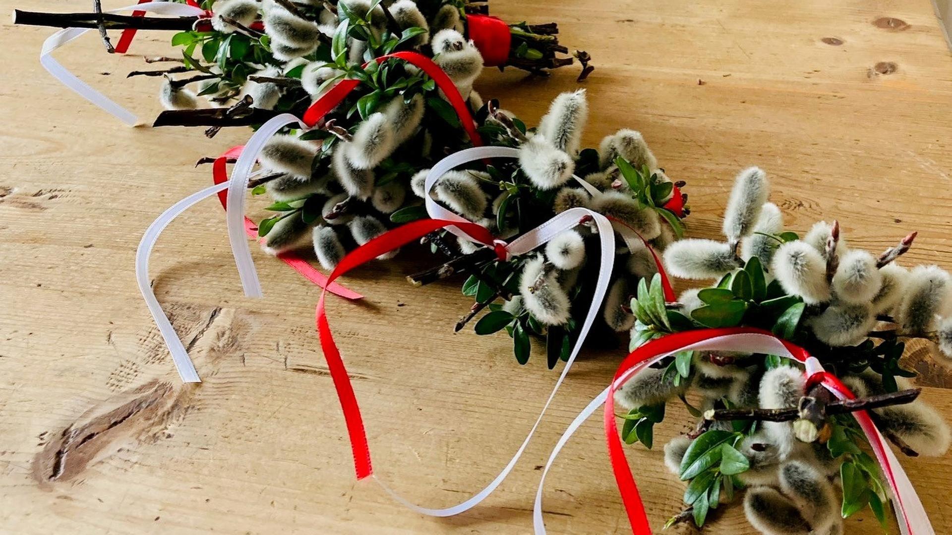 Eine Woche vor Ostern wird der Palmsonntag gefeiert. Dafür werden die Äste der Salweide mit den blühenden Palmkätzchen geschnitten und dann zu schönen Palmbüscherln gebunden. Diese bringen die Kinder zu den Nachbarn und Verwandten, wo sie dann meist im Herrgottswinkel hinters Kreuz gesteckt werden. Im Isarwinkel gibt es auch noch besondere Relikte, wie das Heilige Grab, das hier seit über 300 Jahren in der Kirche St. Michael in Gaißach aufgestellt wird. Und zum fünften Tag in der Karwoche, dem Gründonnerstag gibt es traditionell die Kerbelsuppe. Die Karwoche ist für die meisten Menschen hier noch eine strenge Fastenwoche. Im Gloria der Gründonnerstagsliturgie fliegen die Glocken nach Rom, wie man sagt. Mit dem Gründonnerstag, an dem das letzte Abendmahl Jesu mit seinen Jüngern gefeiert wird, beginnt dann die sogenannte Triduum Sacrum, die Dreitagefeier.