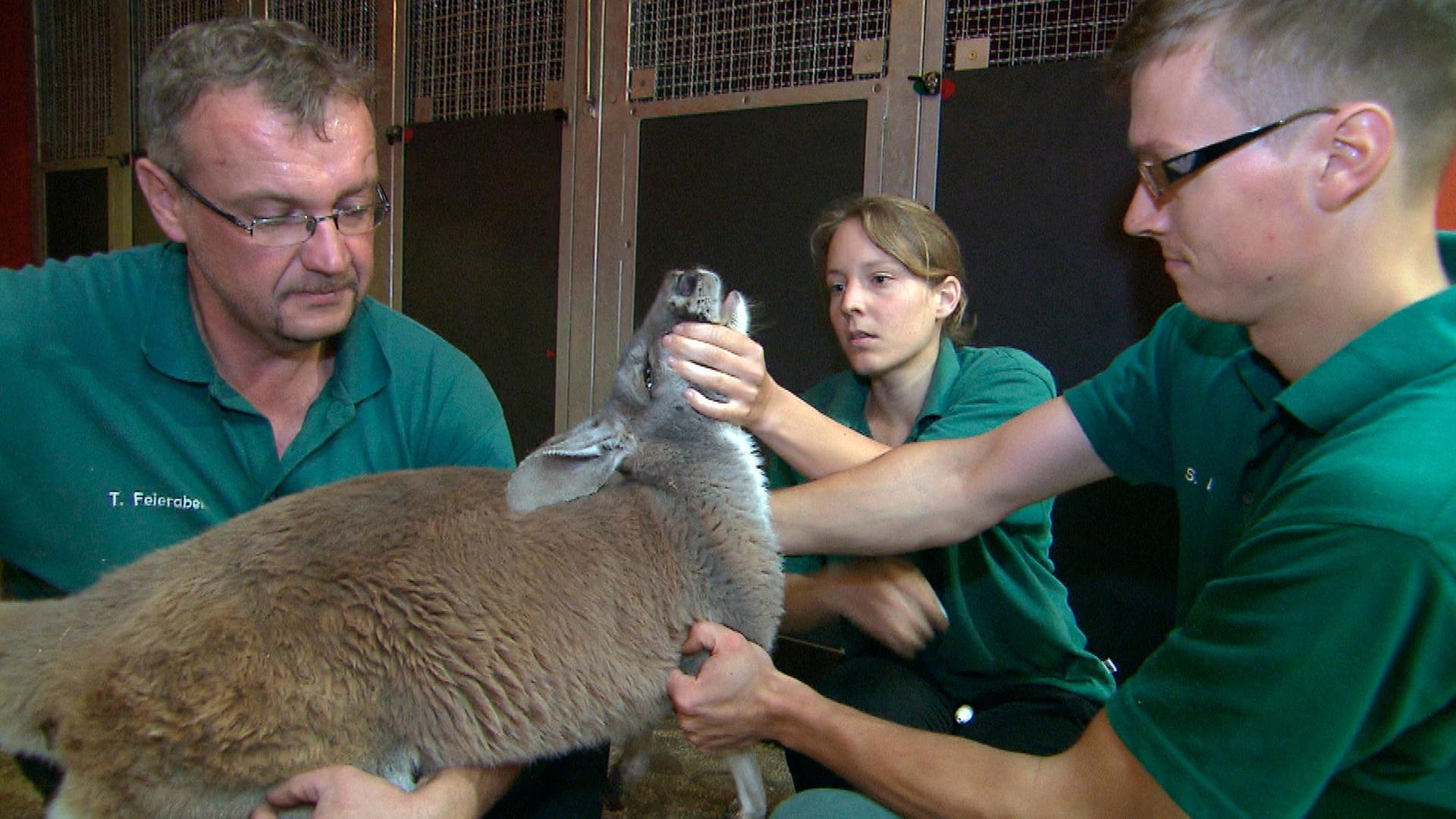 Als Tierpfleger muss man schon Muskeln haben. Jeden Morgen füllt Volker Friedrich seine Schubkarre mit Futtereimern und -boxen und schiebt damit durch sein Revier. Fisch für die Pelikane, Gemüse für die Präriehunde, Pellets für die Alpakas: Jeder von Volkers Schützlingen wird pünktlich frei Haus beliefert. Im "Hagen-out-beck", der Australien-Anlage, sind gleich mehrere Bewohner arg mit kleinen Verletzungen gebeutelt. Vor allem Schrotti hat es gemein erwischt, das Känguru hat einen Abszess am Hals.