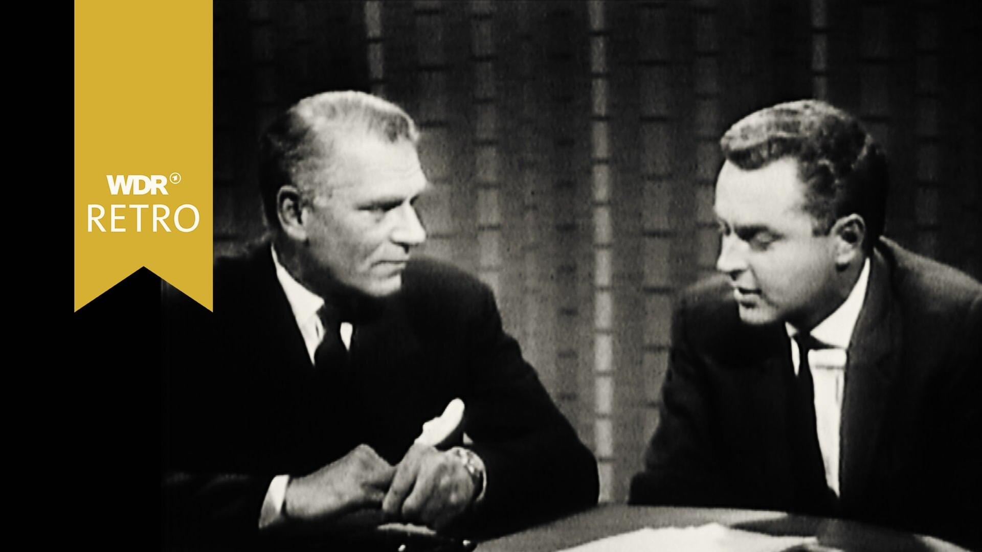 Hanns Joachim Friedrichs im Gespräch mit Schauspieler Sir Laurence Olivier, dem künftigen Leiter des National Theatre London, anlässlich seines Besuchs im Theater Gelsenkirchen.