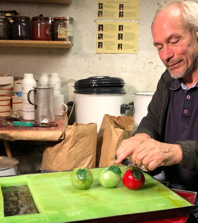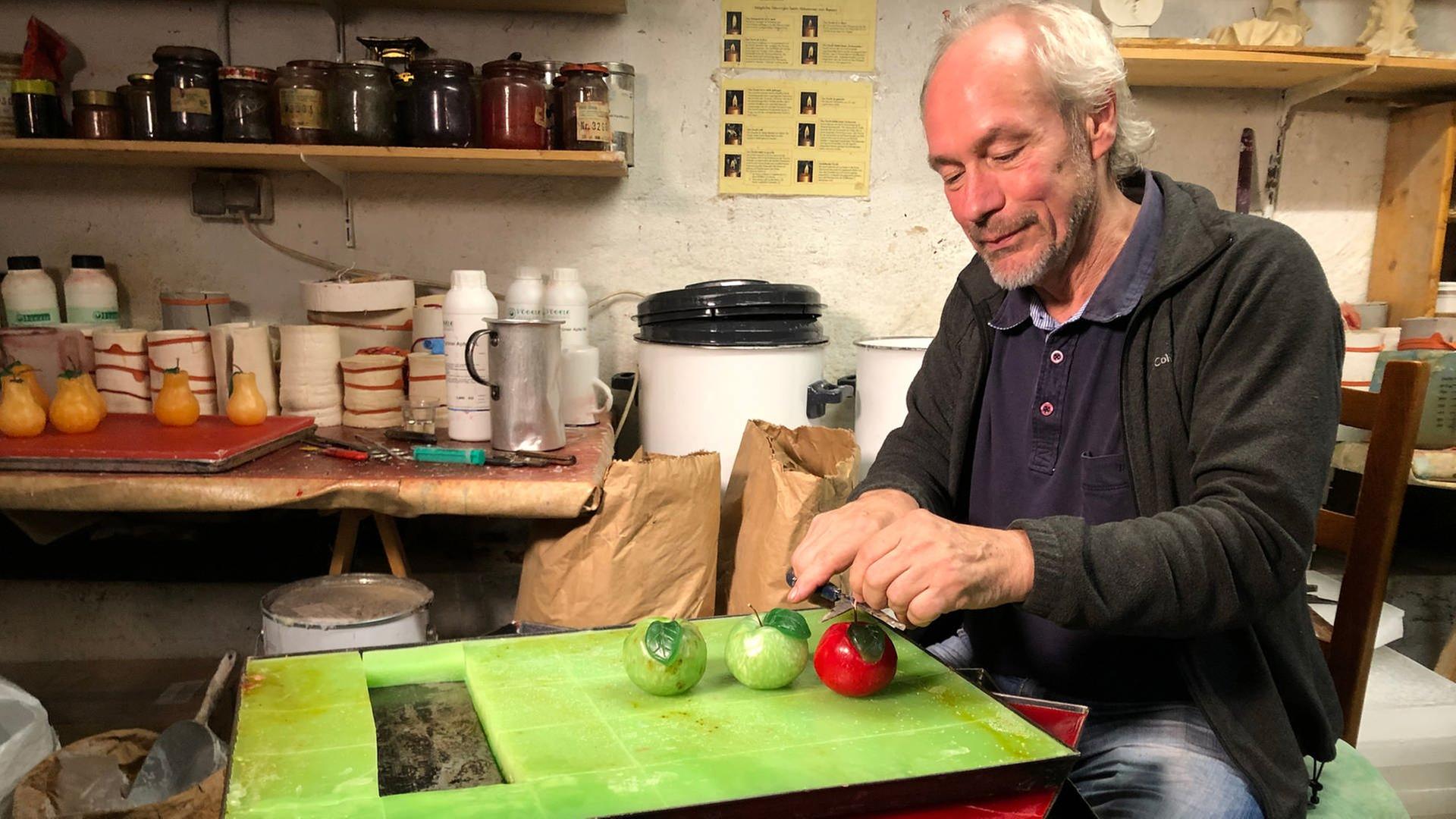 Was wäre Weihnachten ohne Kerzenlicht und die Weihnachtsgeschichte? Wachszieher-Meister Michael Moll zeigt, wie er Kerzen in Form eines Apfels modelliert, inklusive Blatt und Stiel. Ein Kerzenmodell von vielen, die er als Inhaber der "Manufaktur Moll" im rheinland-pfälzischen Manderscheid selbst entwickelt hat und seit Jahren aus hochwertigem Wachs fertigt. Danach setzt und druckt Christoph Sünder vom Mainzer Druckladen des Gutenberg-Museums den Anfang der Weihnachtsgeschichte aus dem Lukas-Evangelium auf Büttenpapier. Letter für Letter setzt er, Farbschicht für Farbschicht trägt er an der Handabzugspresse auf. Handwerk mit Tradition, ausgeführt von einem Druckermeister. Den fertigen Druck illuminiert die promovierte Buchwissenschaftlerin Julia Bangert - mit einer Initiale und farbenreichen Ranken sowie Blattgold im Stil der mittelalterlichen Buchmalerei.