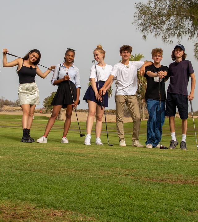 Sofia, Naomi, Lia, Adis, Jasper und Leo schlagen ein paar Bälle beim Golfkurs.