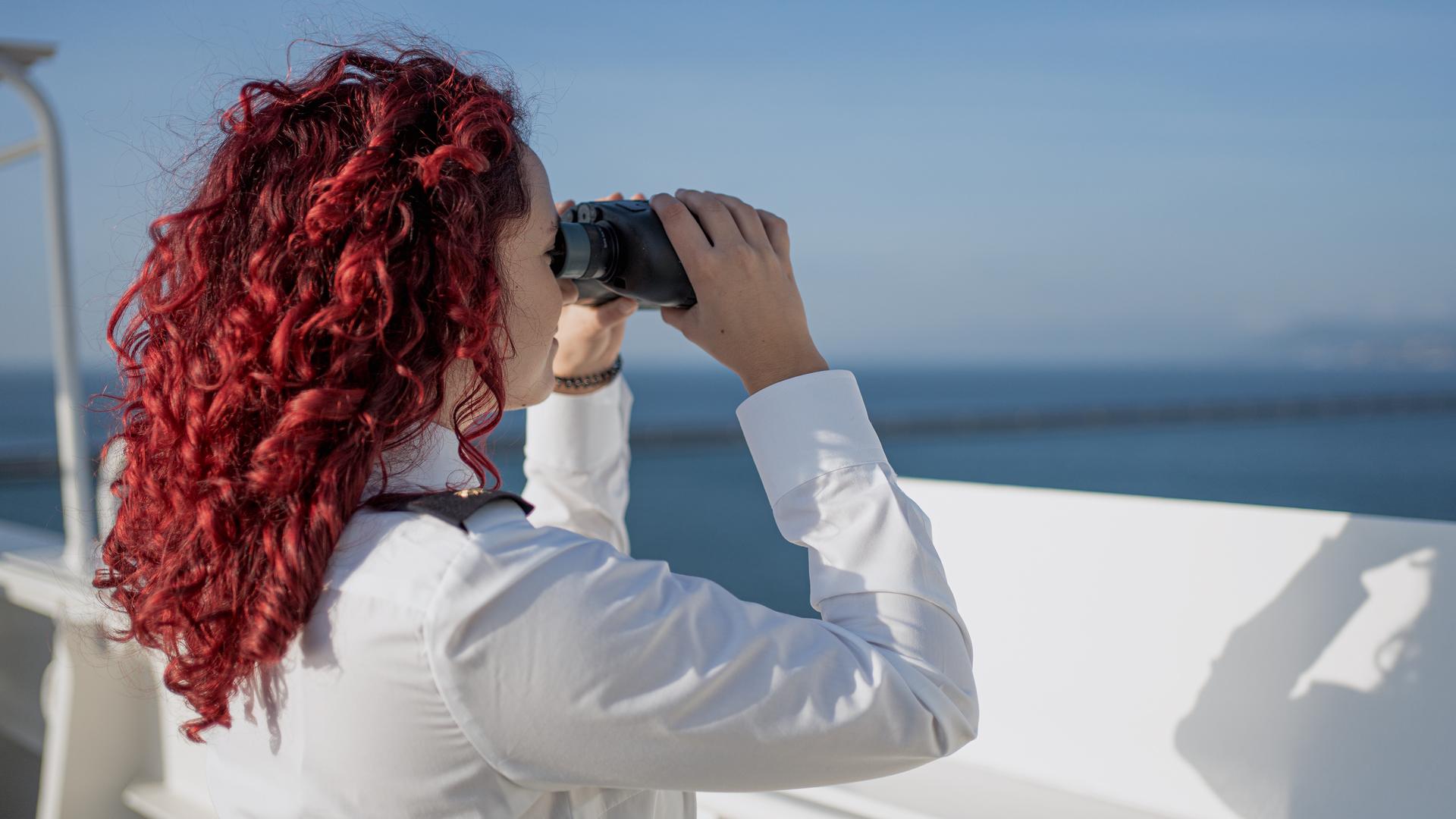 Zum ersten Mal liegen 350 Meter Stahl in ihrer Hand. Das Manövrieren ist Millimeterarbeit. Wird es ihr gelingen, das Schiff sicher aus dem Hafen zu bringen?