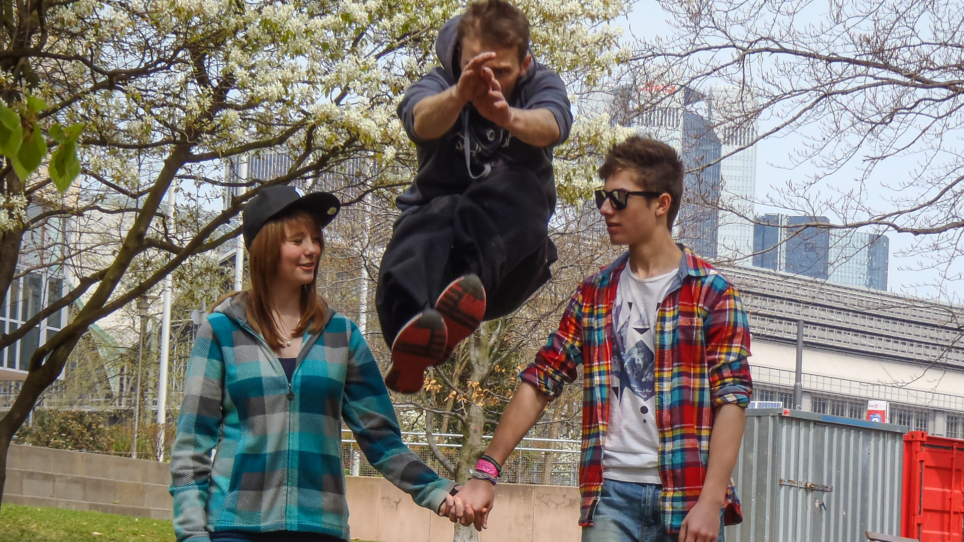 Parkour-Sportler springt über Pärchen