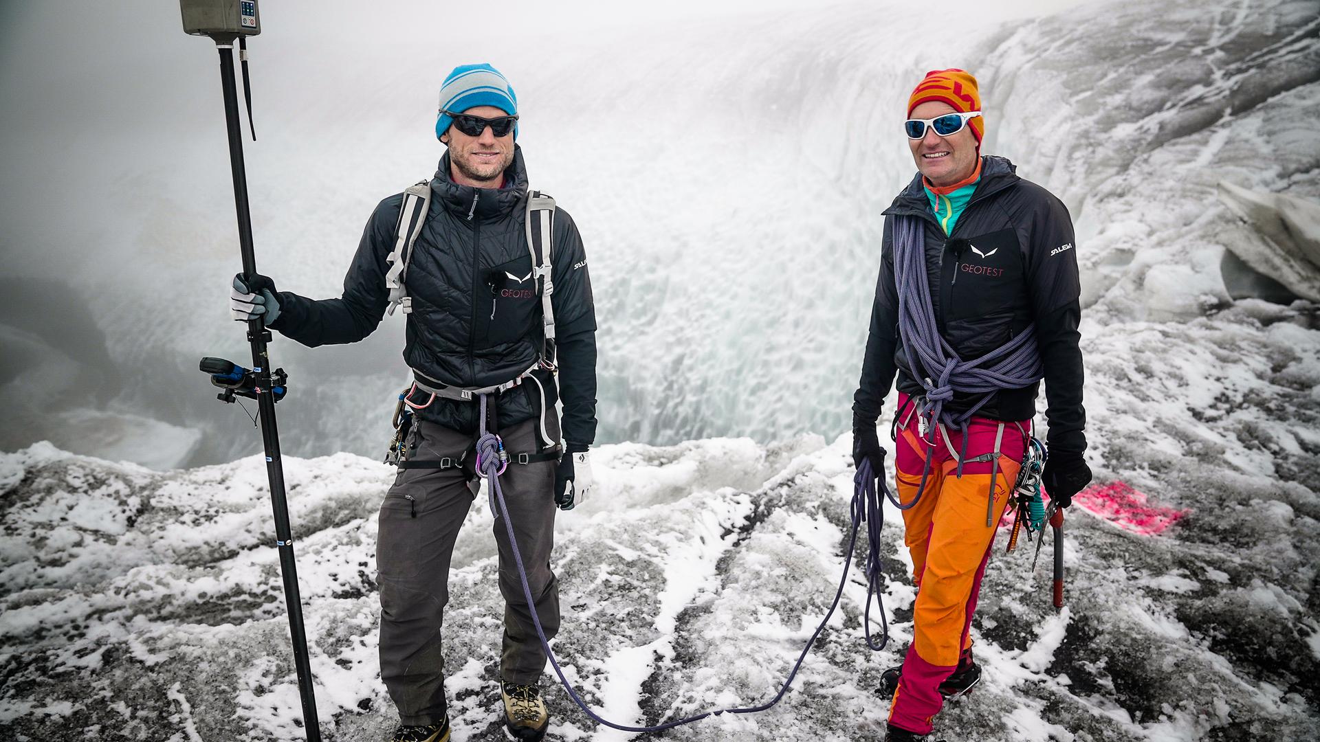 Zwei Männer stehen auf einem Gletscher und schauen in die Kamera.
