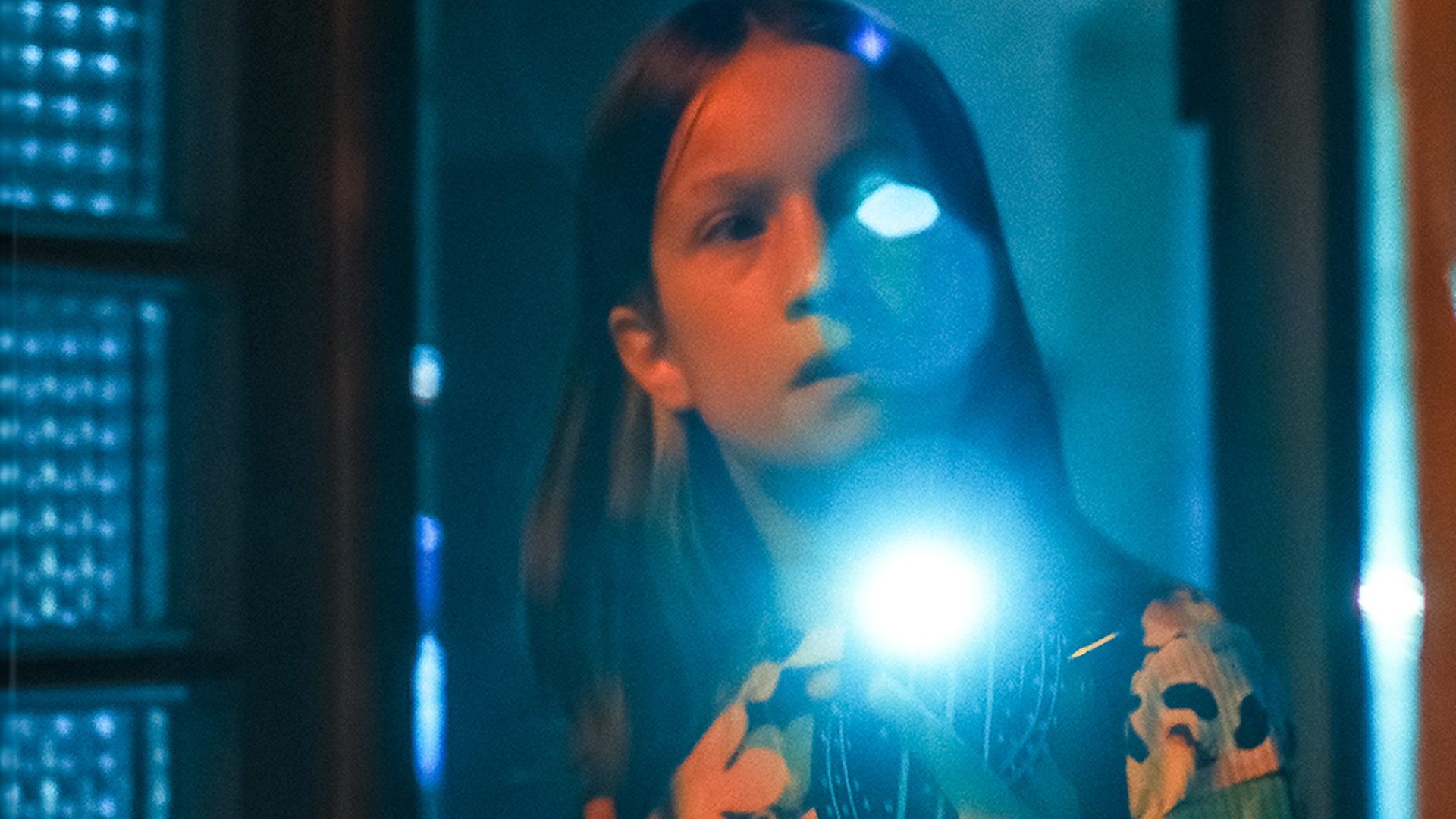 Liv leuchtet im Keller der Schule mit einer Taschenlampe, deren Schein blendet.