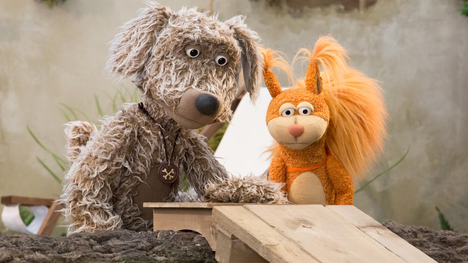 Buffo und Ella stehen hinter einem Holzbrett auf dem sie die Kugeln runterschubsen wollen.
