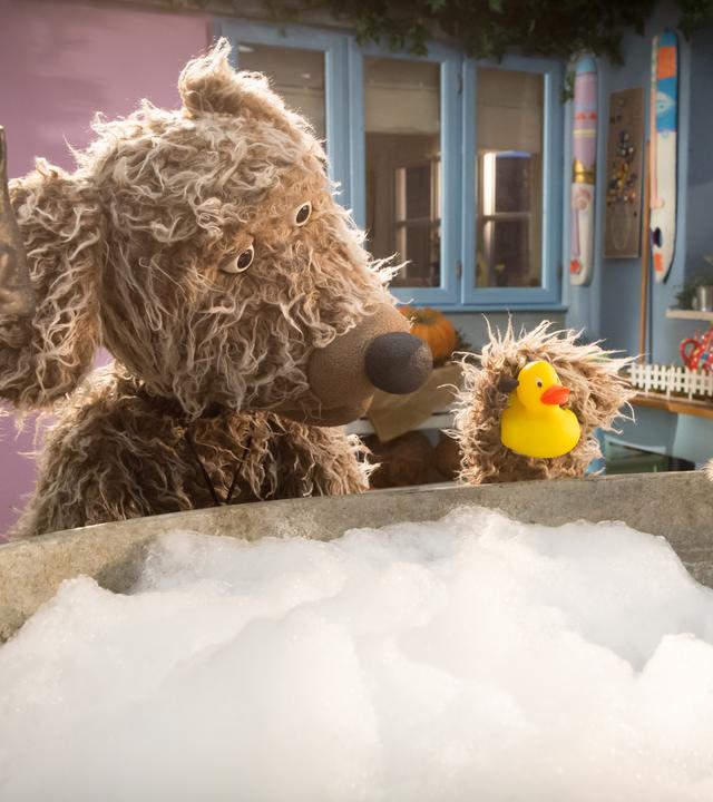 Hund Buffo steht vor der Badewanne und hat eine Quietscheente in der Hand. Wurm Lotti sitzt in der Badewanne und badet.