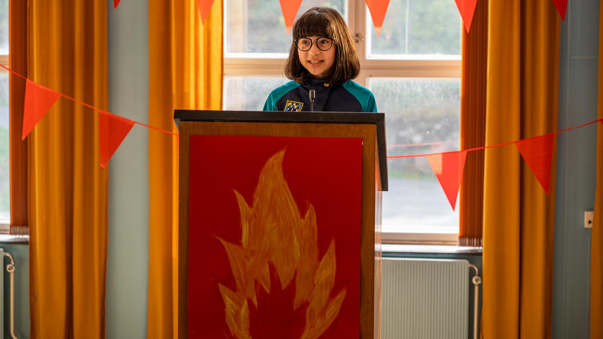 Alpha steht lächelnd und nach vorne blickend an einem Rednerpult, auf dem eine Flamme abgebildet ist. Direkt vor ihr befindet sich ein Mikrofon. Hinter ihr hängen orangefarbene Wimpelketten am Fenster.